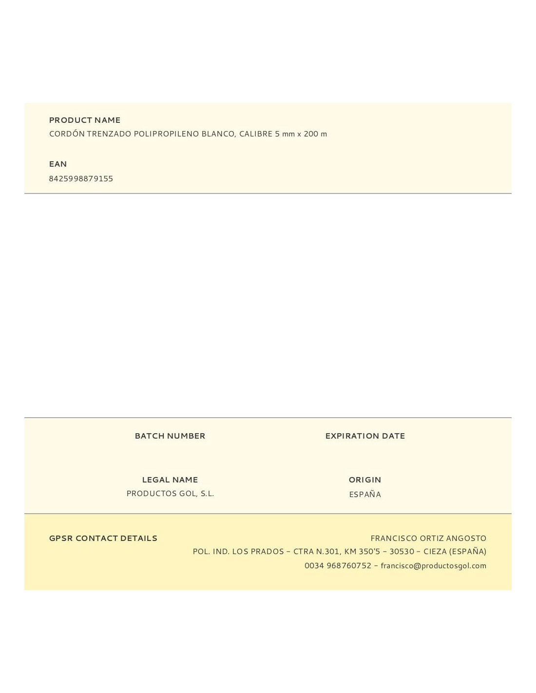 Cordón de polipropileno compuesta por una camisa trenzada exterior de multifilamentos de polipropileno 100% de alta tenacidad con tratamiento uv. producto flexible, suave, buena resistencia de abrasión y alta resistencia al contacto con sustancias químicas. posee flotabilidad y baja absorción al agua. cordón ideal para tendederos interiores y exteriores, persianas, camping, agricultura, ganadería, efectos navales, paquetería, bricolaje. resistencia a la rotura: : 210 kg, medida bobina ø13 x 24,5 cm, medida del agujero central ø2,5 cm