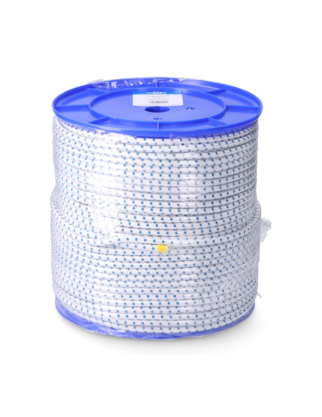 Cuerda elástica de camisa trenzada de poliester de alta tenacidad con torsión y alma de látex, con protección uv. producto flexible, alta elasticidad y muy buena recuperación. suve al tacto y resistente. cordón ideal para toldos, lonas, amarre, tendederos, invernaderos, ganadería, efectos navales, bricolaje. resistencia a la rotura: 1.280 kg, medida bobina ø26 x 22 cm, medida agujero central ø3 cm