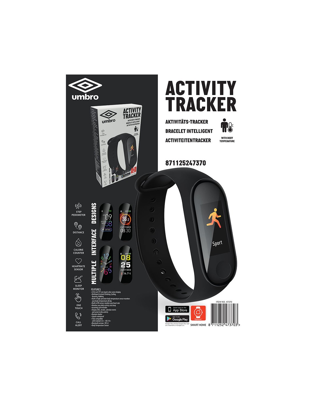 Pulsera monitor de actividad umbro. funciones: podómetro, medidor de calorias quemadas, pulsómetro, monitor de sueño y temperatura, alerta de llamadas y notificaciones de mensajes. pantalla de 0,96 pulgadas a color. resistente a salpicaduras. incluye cargador. consultar manual de instrucciones para características completas.