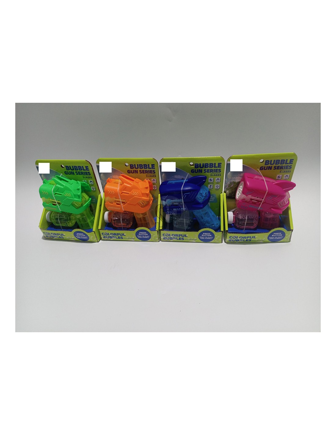 Pistola para pompas de jabón con luz de 12,5 cm. funciona con pilas 3 x aa ( no incluidas), incluye 50 ml de jabón, colores surtidos