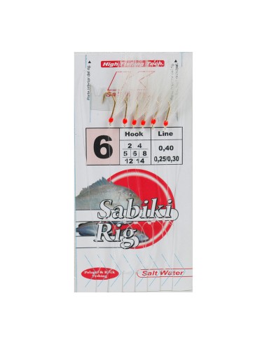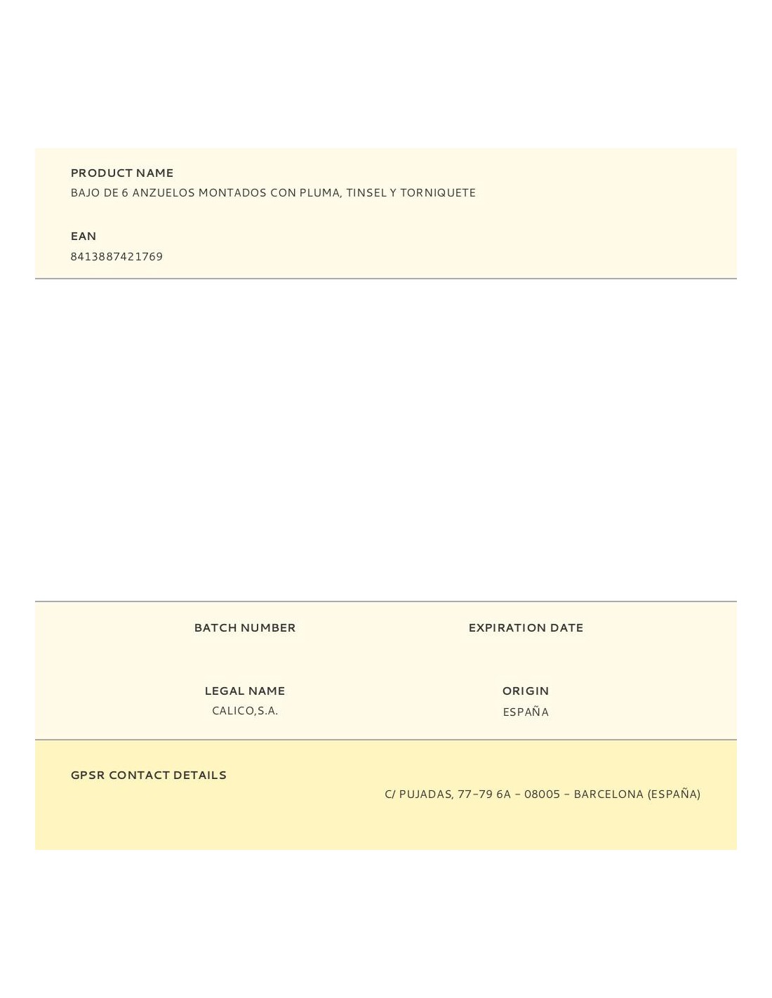 Bajo de 6 anzuelos montados con pluma y tinsel y torniquete en cada extremo presentado sobre carton para facilitar su rapido montaje