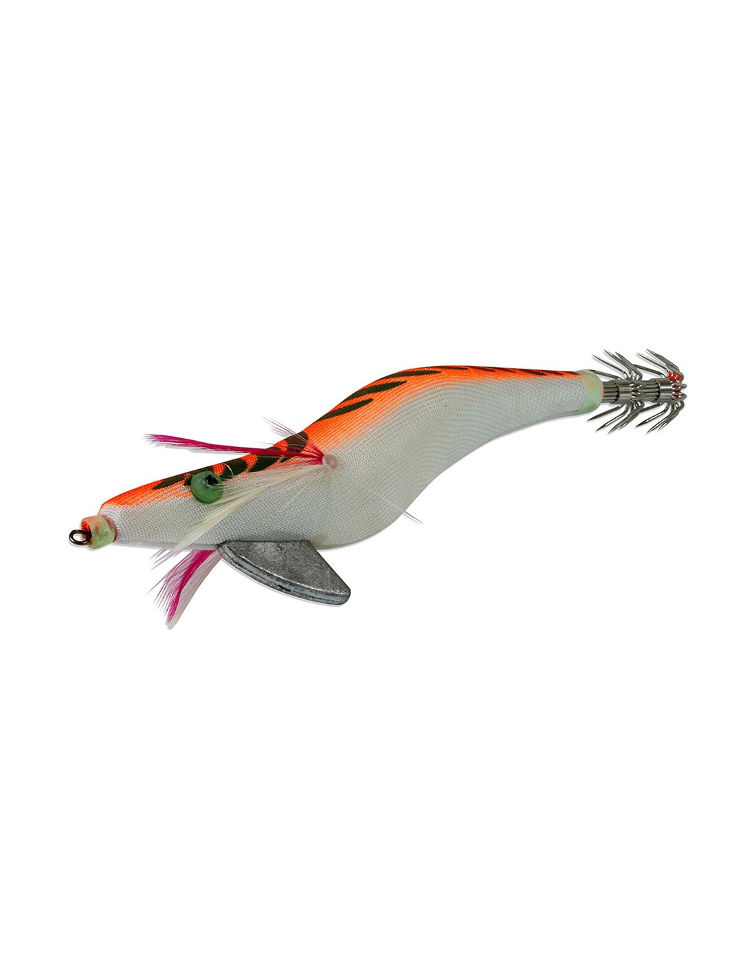 Señuelo artificial especial para la pesca del calamar y la sepia. color naranja barriga blanca. medidas: 135 mm de largo y 16 g de peso