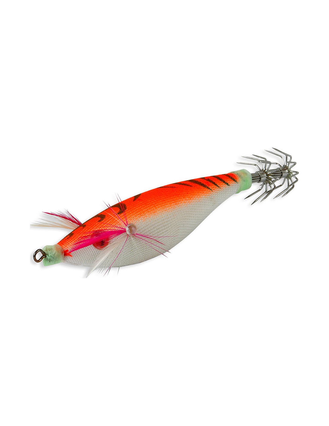Pajarito para la pesca del calamar y sepia en embarcación, forrado de tela y con barriga luminiscente. color naranja barriga blanca, 100 mm de largo