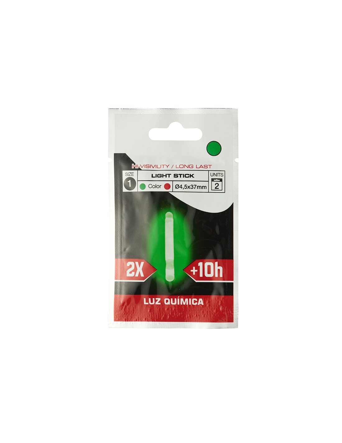 Gusano de luz química verde, especial para poder ver en la oscuridad la puntera de nuestra caña como un flotador. duración aproximada 10 horas, dimensiones ø4,5 x 37 mm, 2 uds