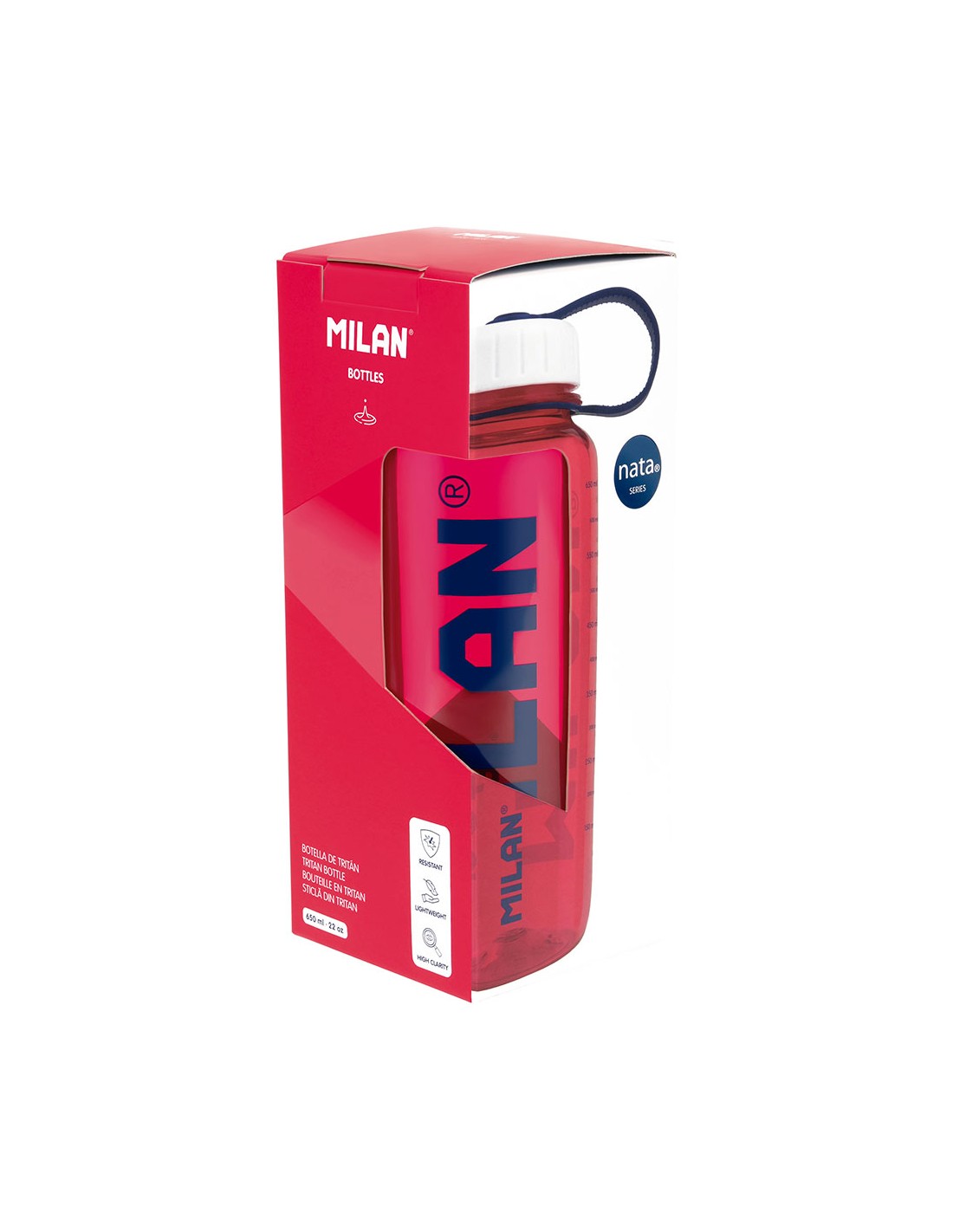 Botella reutilizable de color rosa intenso. colección milan nata® 624. con dosificador extraíble. escala impresa para medir el consumo de líquidos. alta resistencia a la rotura y a temperaturas desde los -20°c hasta los 80°c. libre de bisfenol (bpa free). no transmite olores ni sabores. reciclable. tapón de rosca hermético de plástico de color blanco. apto para lavavajillas. no apto para microondas. medidas de la botella: ø7,6 x 21,5 cm. capacidad: 0,65 l