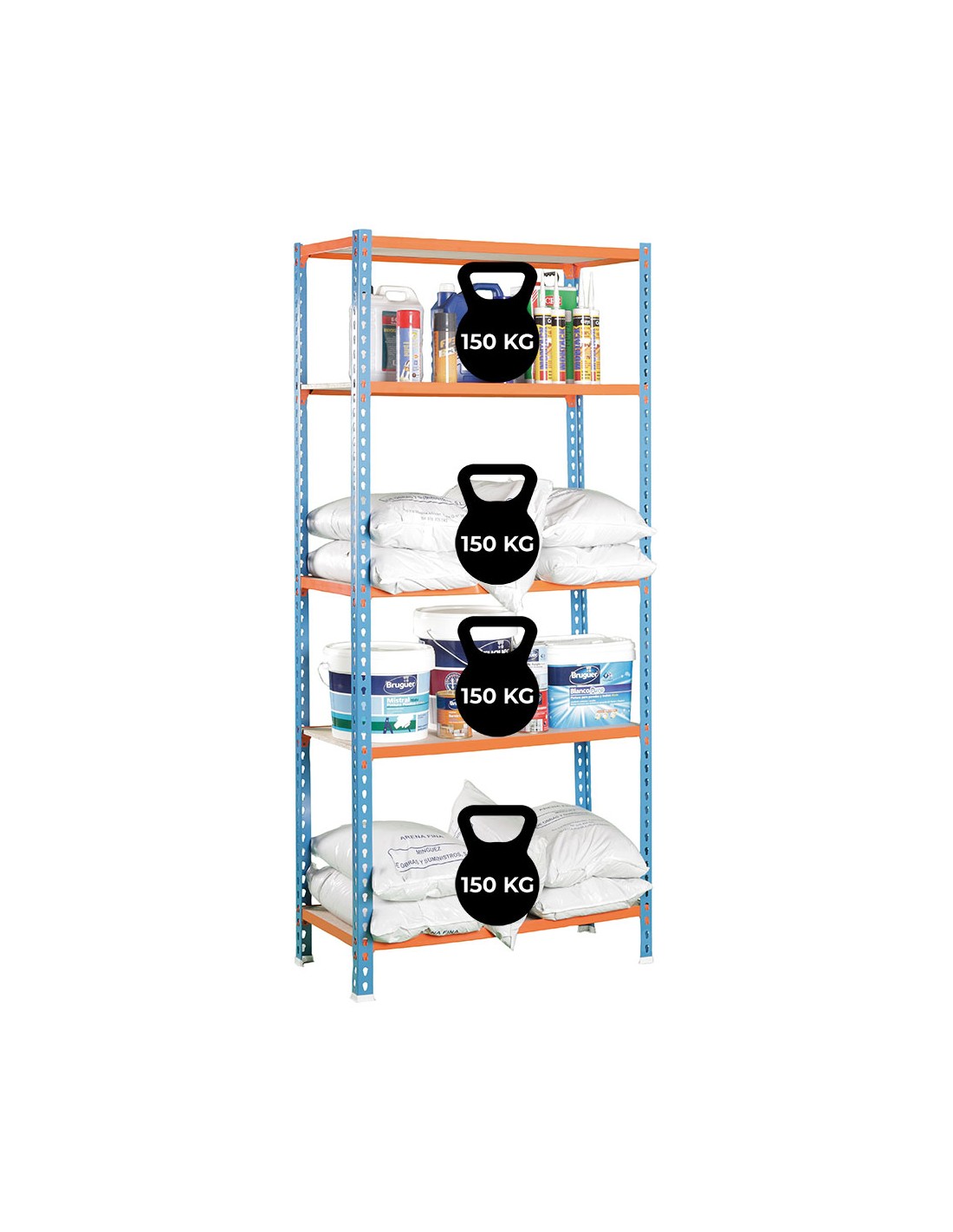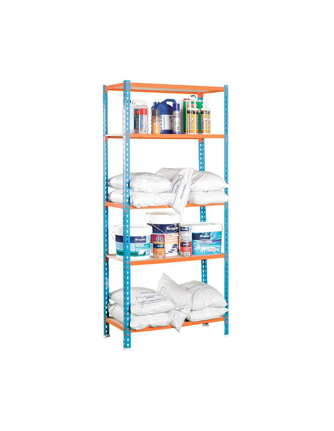 Estanteríametálicasintornillosdecolorazul/naranja/maderaconcapacidaddecargaporestantede150kg.elnúmerodeestanteses5ylasmedidas(altoxanchoxfondo)son1800x900x400mm.tieneestantesdeaglomeradode12mm.productoespañoldecalidadeuropea,medidasenusodelproducto:1787x877x410mm