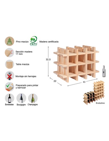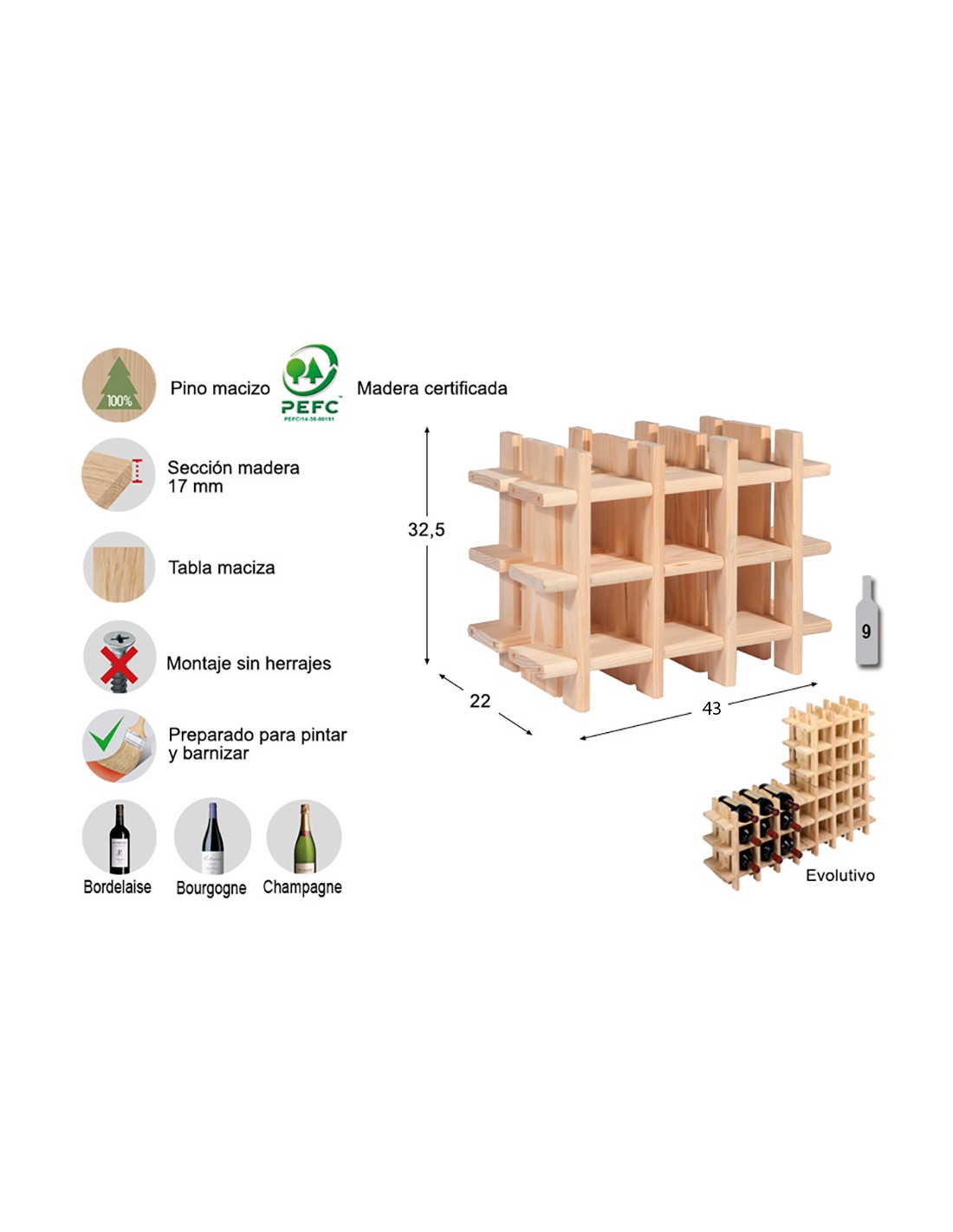 Botellero evolutivo rioja para 9 botellas pino macizo 43x22x32,5cm astigarraga