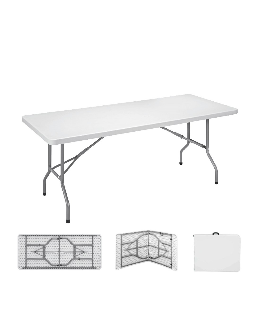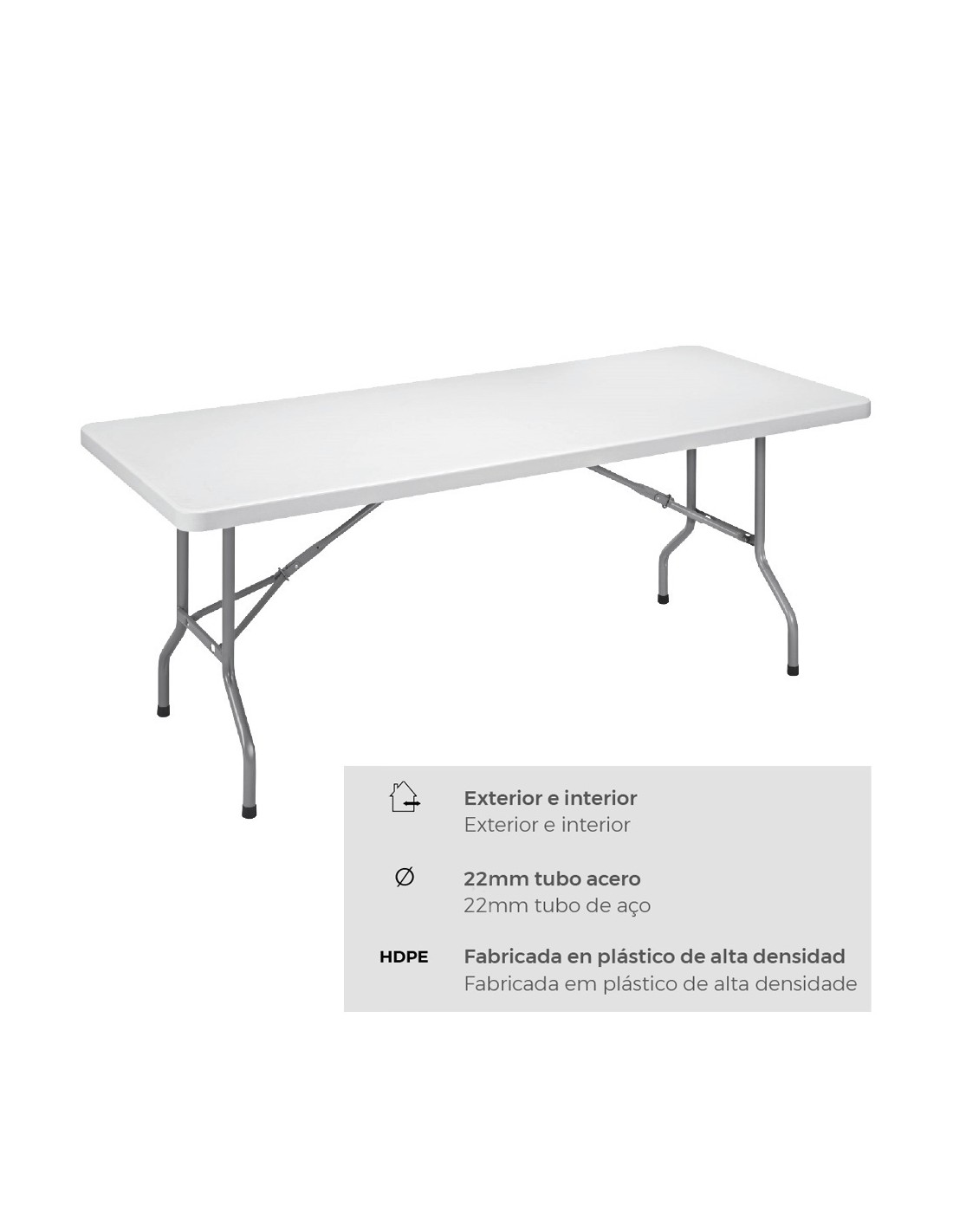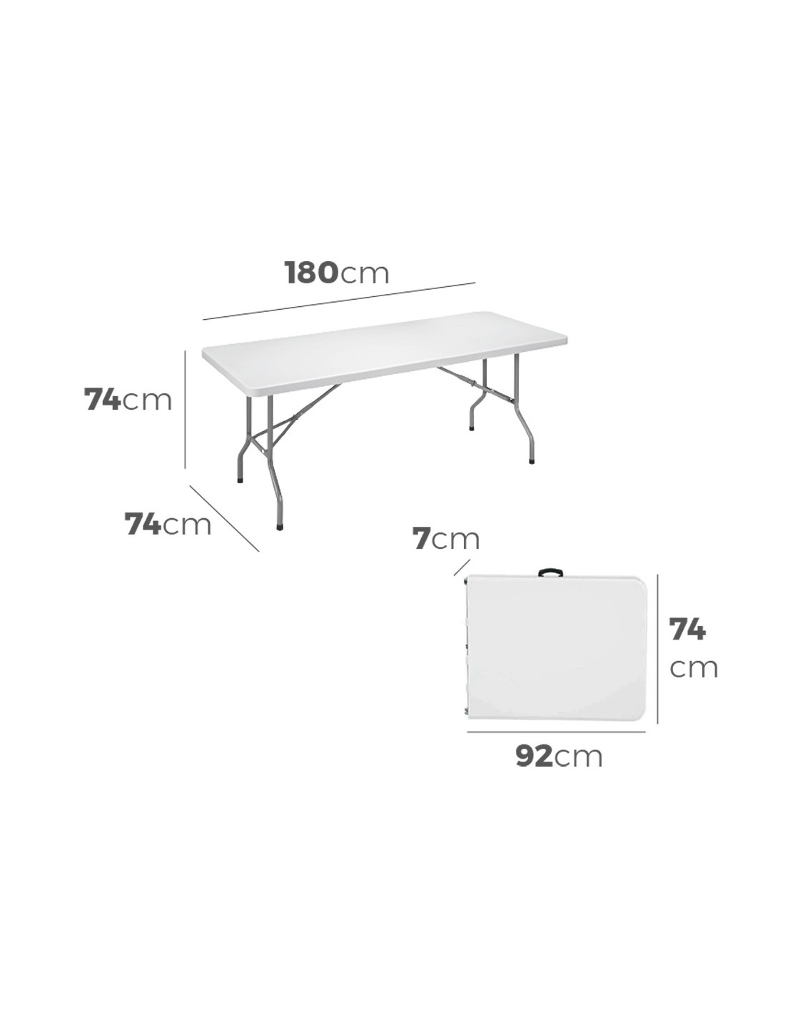 Mesa plegable dimensiones montada: 180x74x74cm (ancho/fondo/alto) medida plegada: 95x35x9cm (ancho/fondo/alto). tubo ø22x1.0mm. uso exterior e interior, acero, fabricado en plástico de alta densidad. no apta para uso profesional
