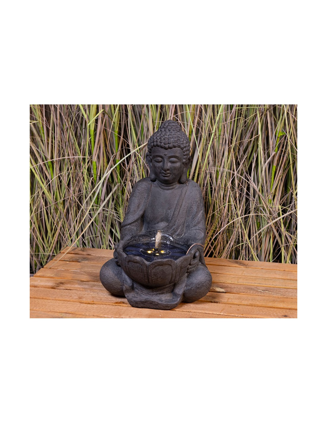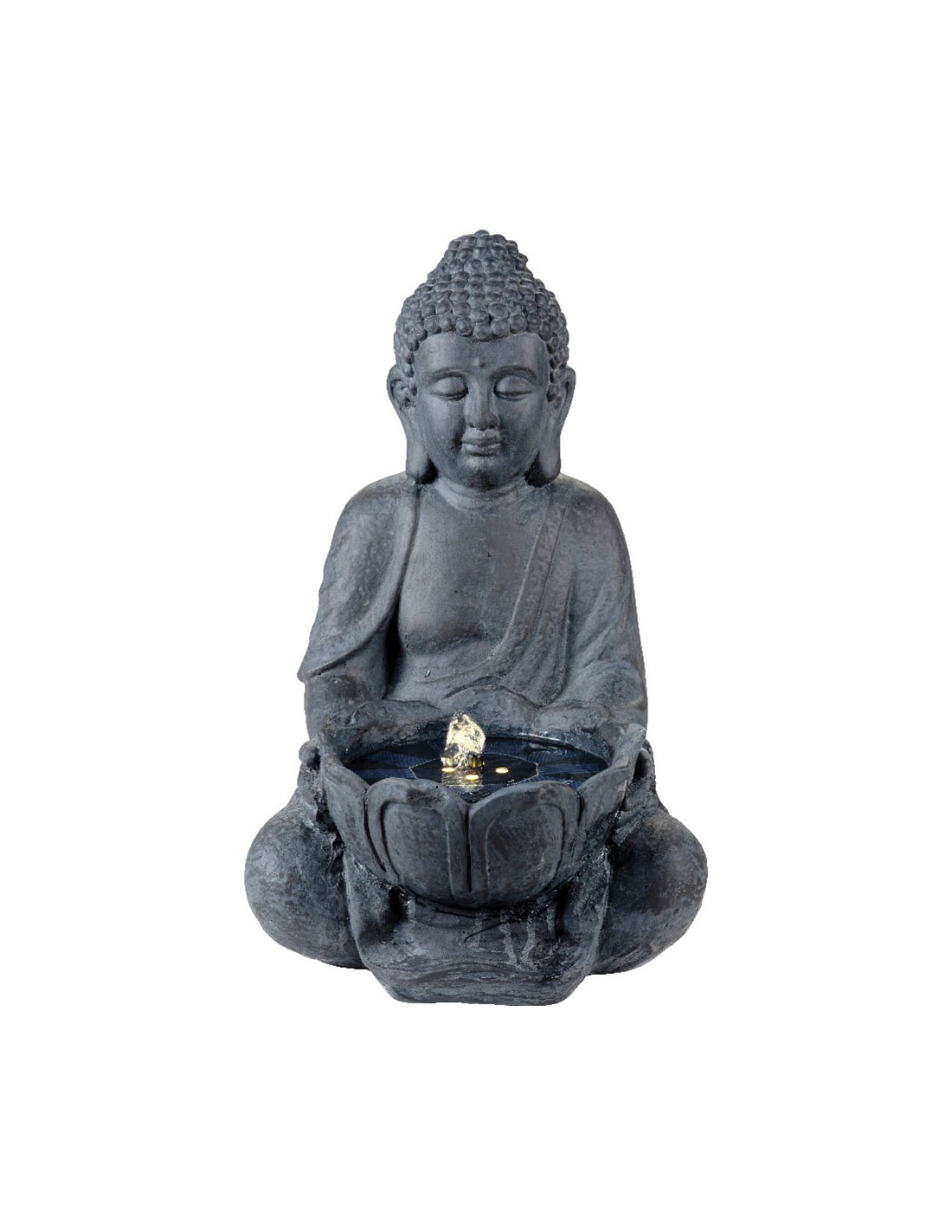 Fuente buda solar. luz cálida 4 leds. dimensiones: 29,5x28x45cm (ancho/fondo/alto) ip68. función apagado automático. caudal de agua ajustable. función día y noche hasta 4 horas después del anochecer. con apariencia y estilo de piedra.