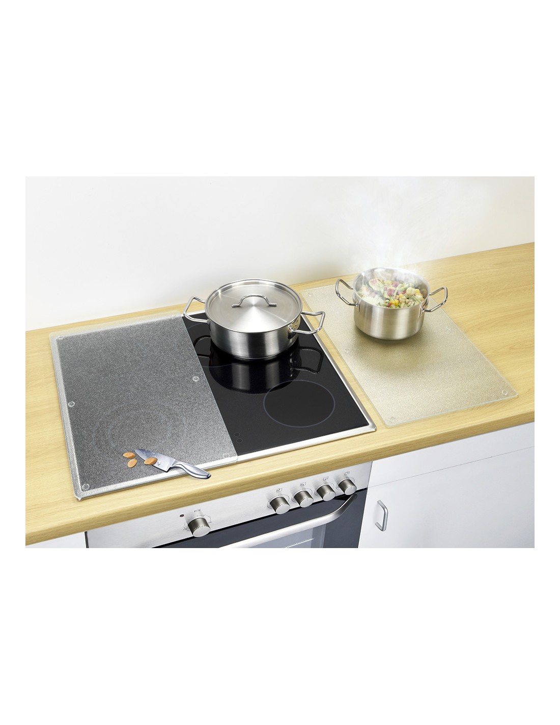 Placas cobertoras de vidrio transparente 2 unid. vidrio templado de 4mm. con un recubrimiento de protección especial que ofrece seguridad en el caso de utilización extrema. las 4 patas antideslizantes permiten la utilización en cocinas vitrocerámicas e induccion. higiénica, inodora, resistente a los rasguños y golpes. dimensiones: 30x52cm.