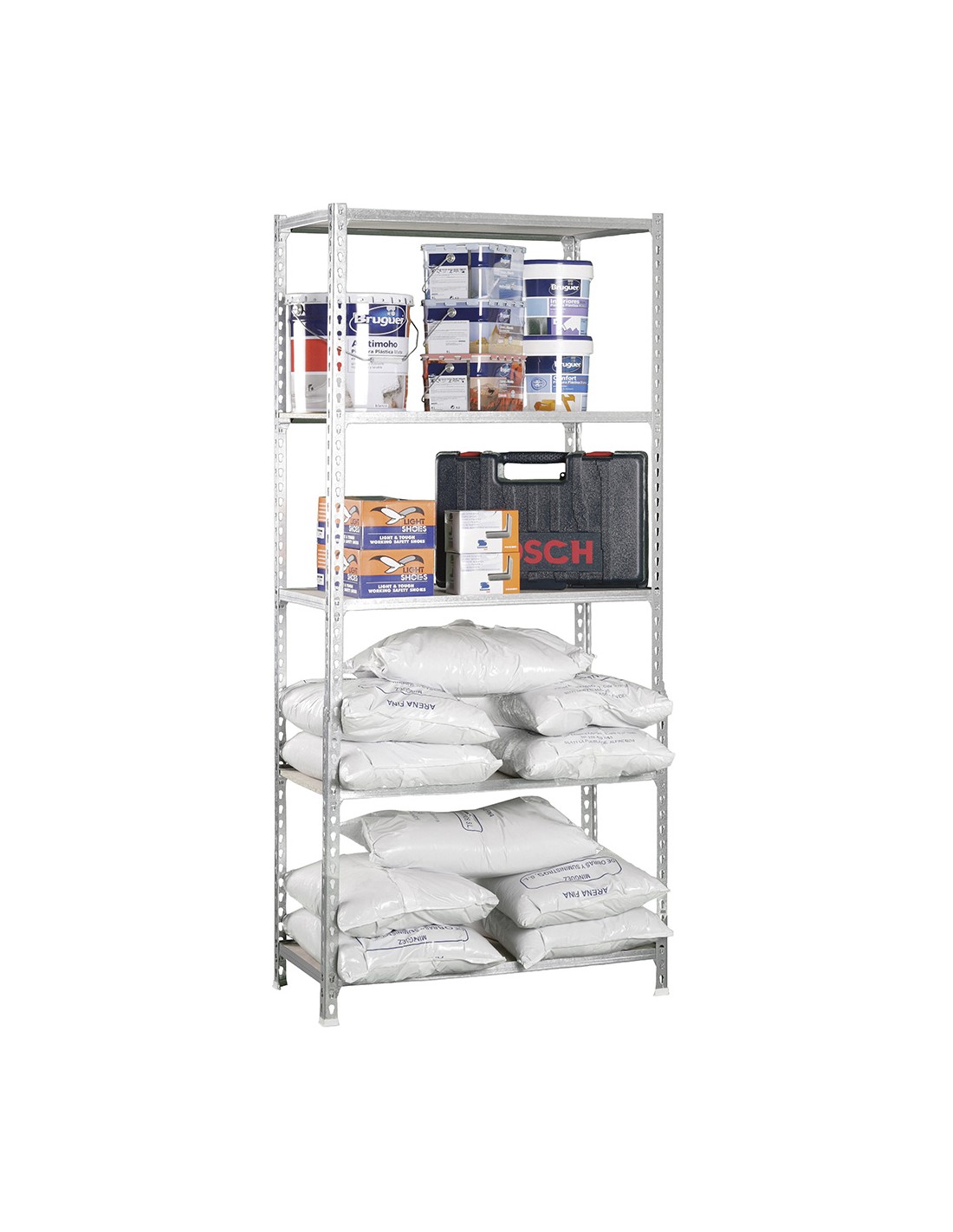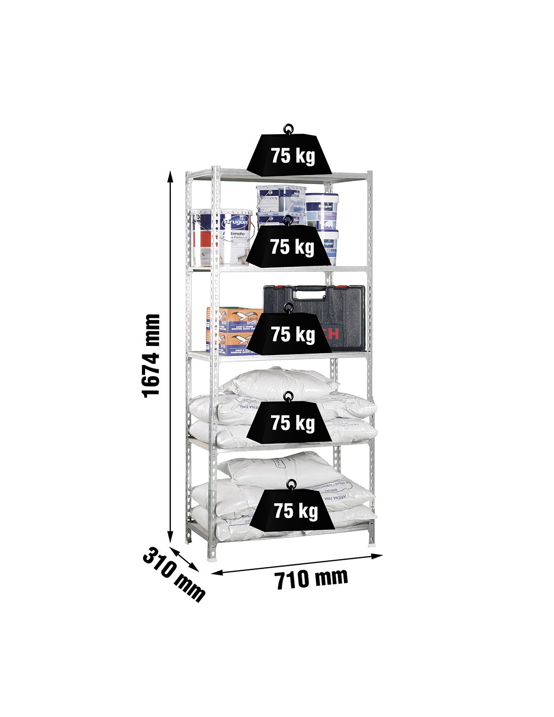 Estanteria madera sin tornillos, color galva/madera con capacidad de carga por estante de 75 kg. el numero de estantes es 5 y las medidas (alto x ancho x fondo) son 167.4x71x31cm. tiene estantes de aglomerado de 8mm. producto español de calidad europea simon rack