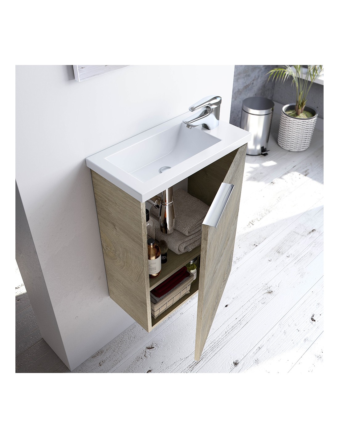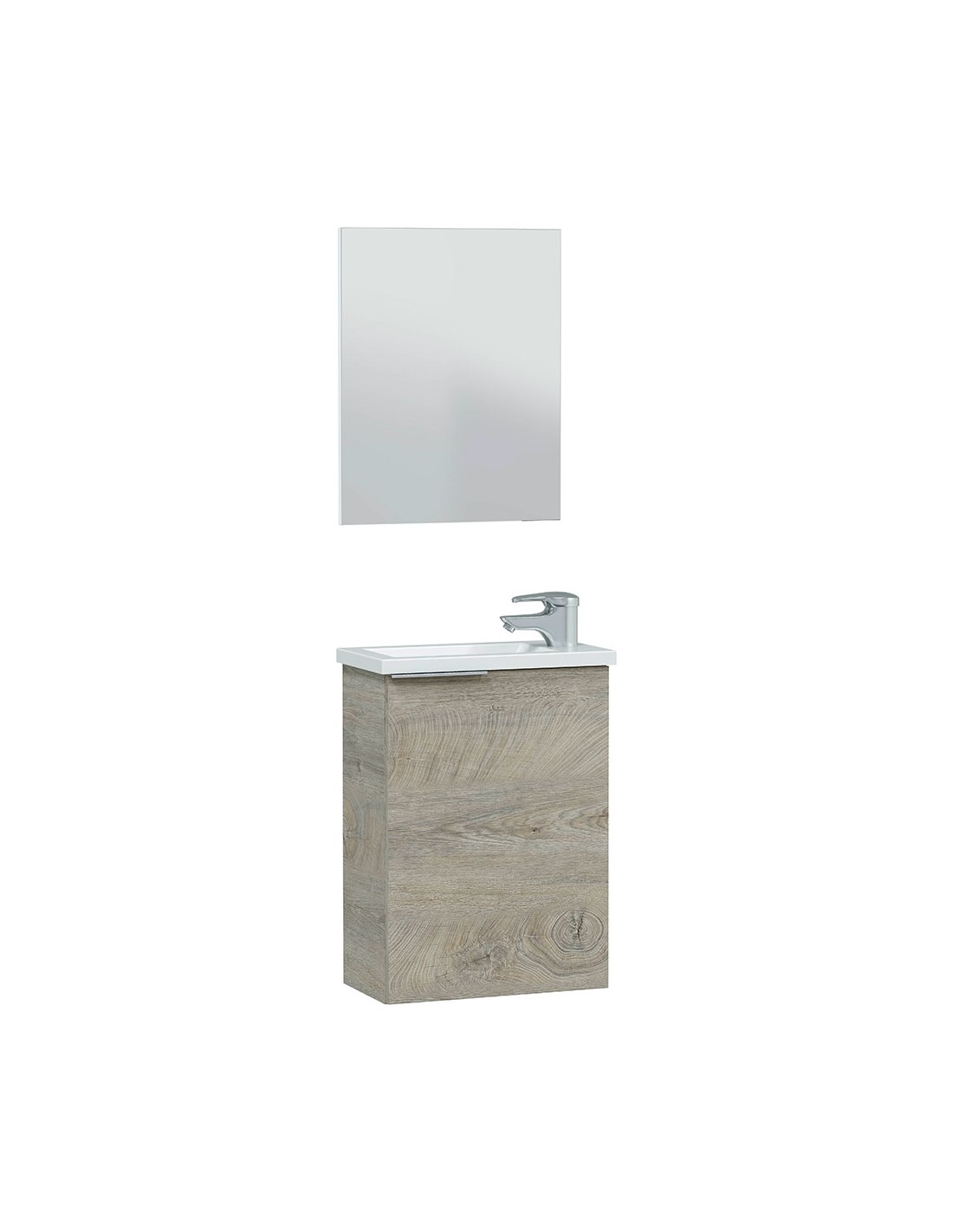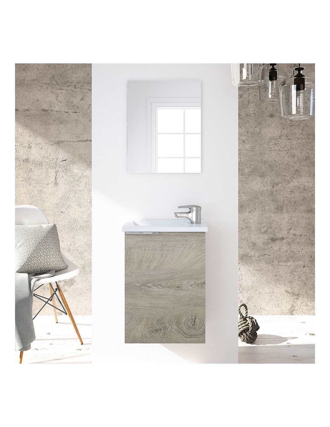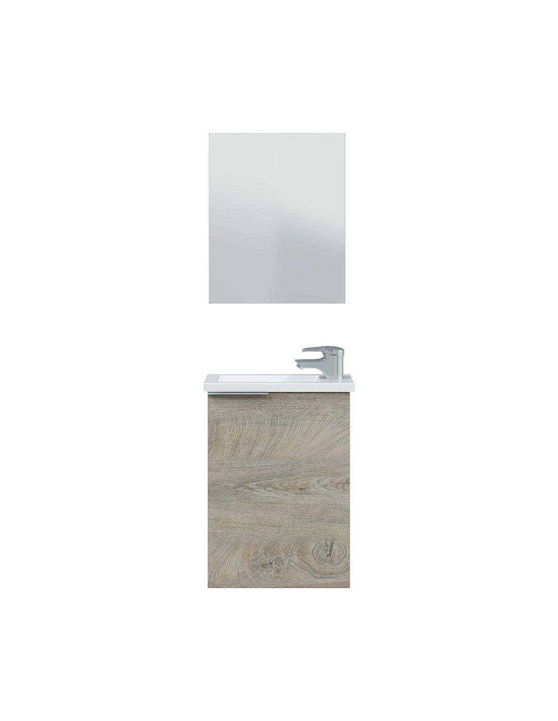 Mueble para baño compact acabado en color roble alaska. modelo para aseos pequeños y estrechos gracias a su poca profundidad. diseño fácil y práctico fabricado en melamina de alta calidad, incluye lavabo de resina y espejo. el armario inferior tiene un estante regulable en altura y bisagras con cierre progresivo soft closet. además, la puerta se puede montar con apertura a un lado y al otro. incluye los dispositivos de fijación del mueble a la pared. medidas mueble lavabo: alto 58 cm ancho 40 cm profundo 22 cm espejo: alto 50 cm ancho 40 cm profundo 1'8 cm lavabo: alto 2'5 cm ancho 40 cm profundo 22 cm. (grifería, sifón y válvula no incluidos) servicio de postventa gratuito: postventa@fores-group.com