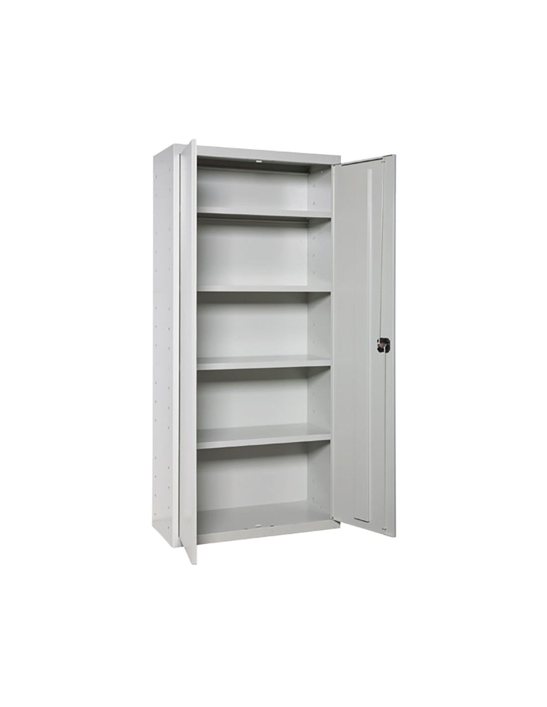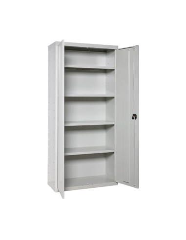 Armario multiusos metalico diy de color gris y las puertas grises. con 2 puertas y 4 estantes con capacidad de carga de 75 kg cada uno, carga certificada a punto de flexion. se entrega desmontado. las dimensiones del armario 80 x 40 x 180 cm. manipulacion sin riesgo, no contiene aristas de corte. con recubrimiento epoxi poliester antirayaduras e ignifugo. producto fabricado en españa.