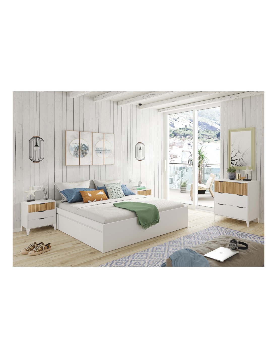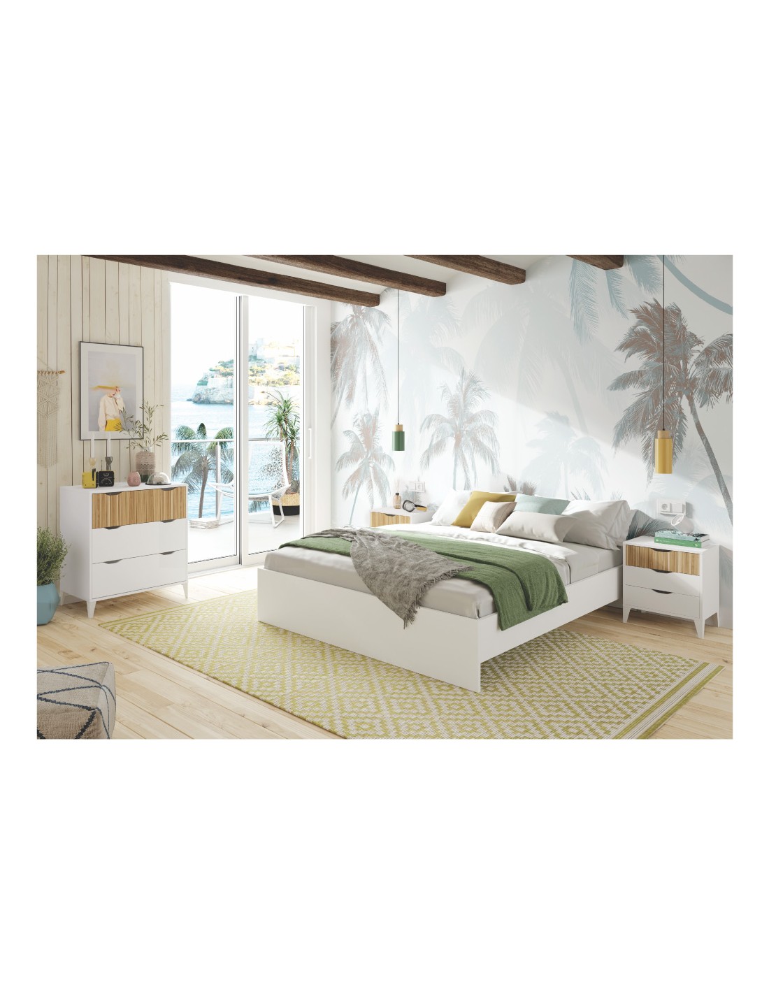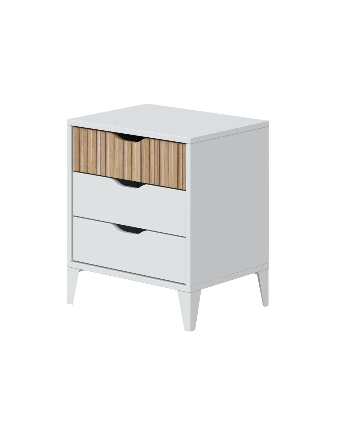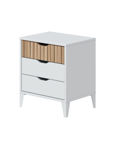 Mesita de noche con 3 cajones. color blanco + natural. material: melamina. contiene: correderas no extraibles de metal patas abs 10 cm alto de los cajones 12 cm peso soportado por cada cajón 5 kg peso maximo soportado total 15 kg. medidas: 40 x 33 x 50 cm. servicio de postventa gratuito: postventa@fores-group.com