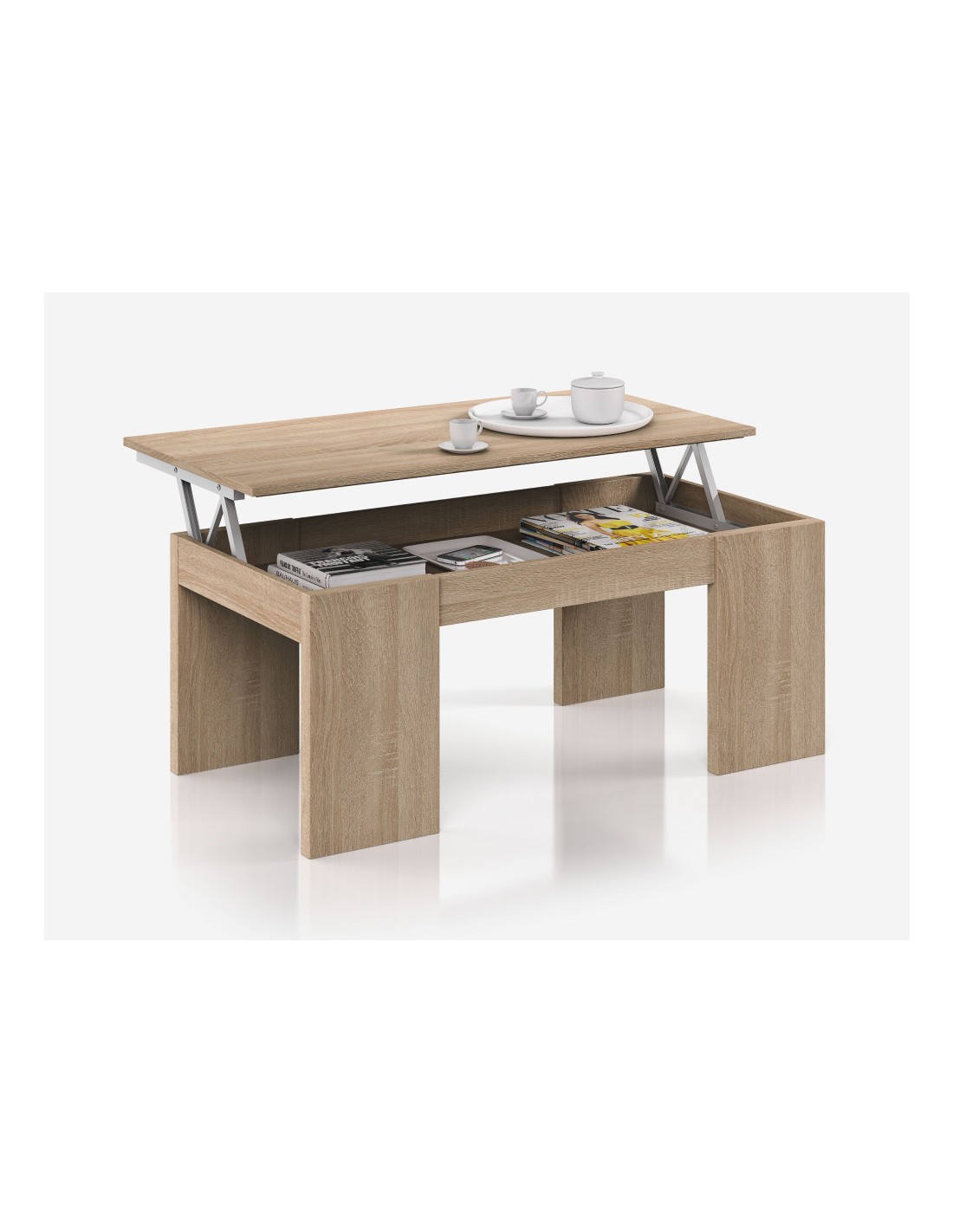 Mesa centro elevable con espacio de almacenamiento que queda oculta al cerrar la tapa. color: roble. material: melamina. contiene: bisagras metálicas. medidas cerrada: 100 x 50 x 43 cm abierta: 100 x 68 x 54 cm hueco contenedor: 97 x 44 x 6 cm. servicio de postventa gratuito: postventa@fores-group.com
