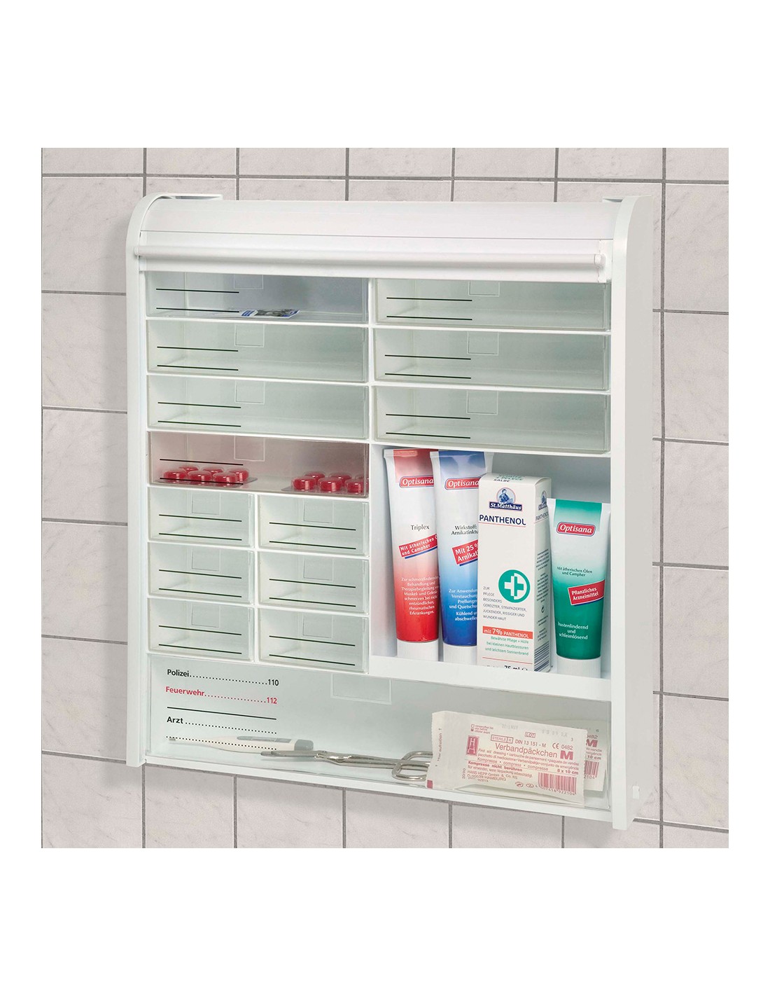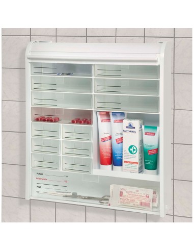 Armario con cierre de persiana que no ocupa espacio lateral y evita posibles golpes con la puerta. con cerradura para evitar el acceso de los niños. 14 cajones transparentes, uso para artículos de todo tipo: botiquín, baño, cosmético, etc. medidas 42 x 48 x 10 cm. material : pp + ps