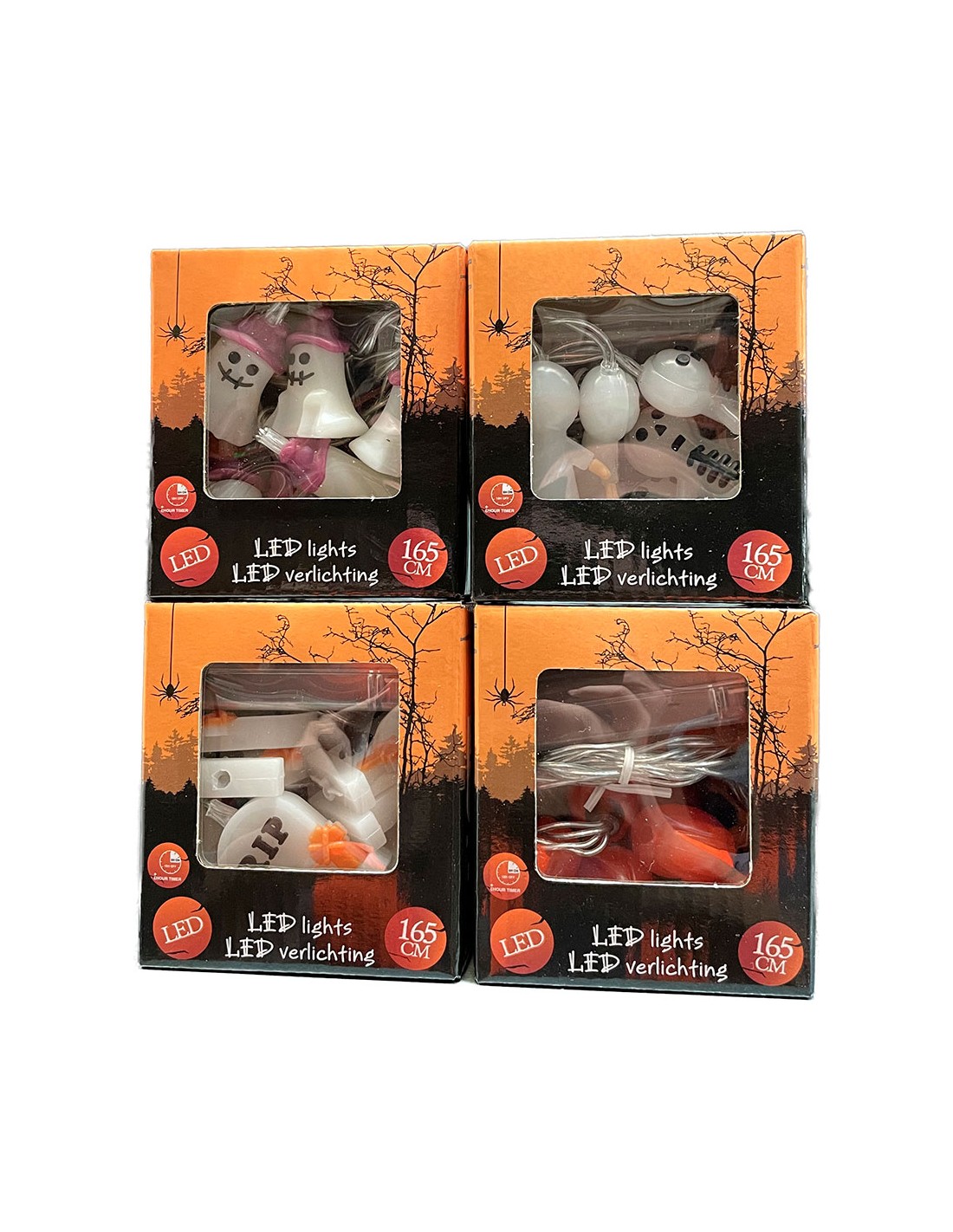 Guirnalda led con 10 figuras de hallowen, cable transparente, temporizador 6 h / 18 h, funciona con pilas 2 x aa (no incluidas), cable de alimentación 30 cm, distancia entre figura 15 cm, largo total 165 cm, presentado en expositor de 20 uds, modelos variados