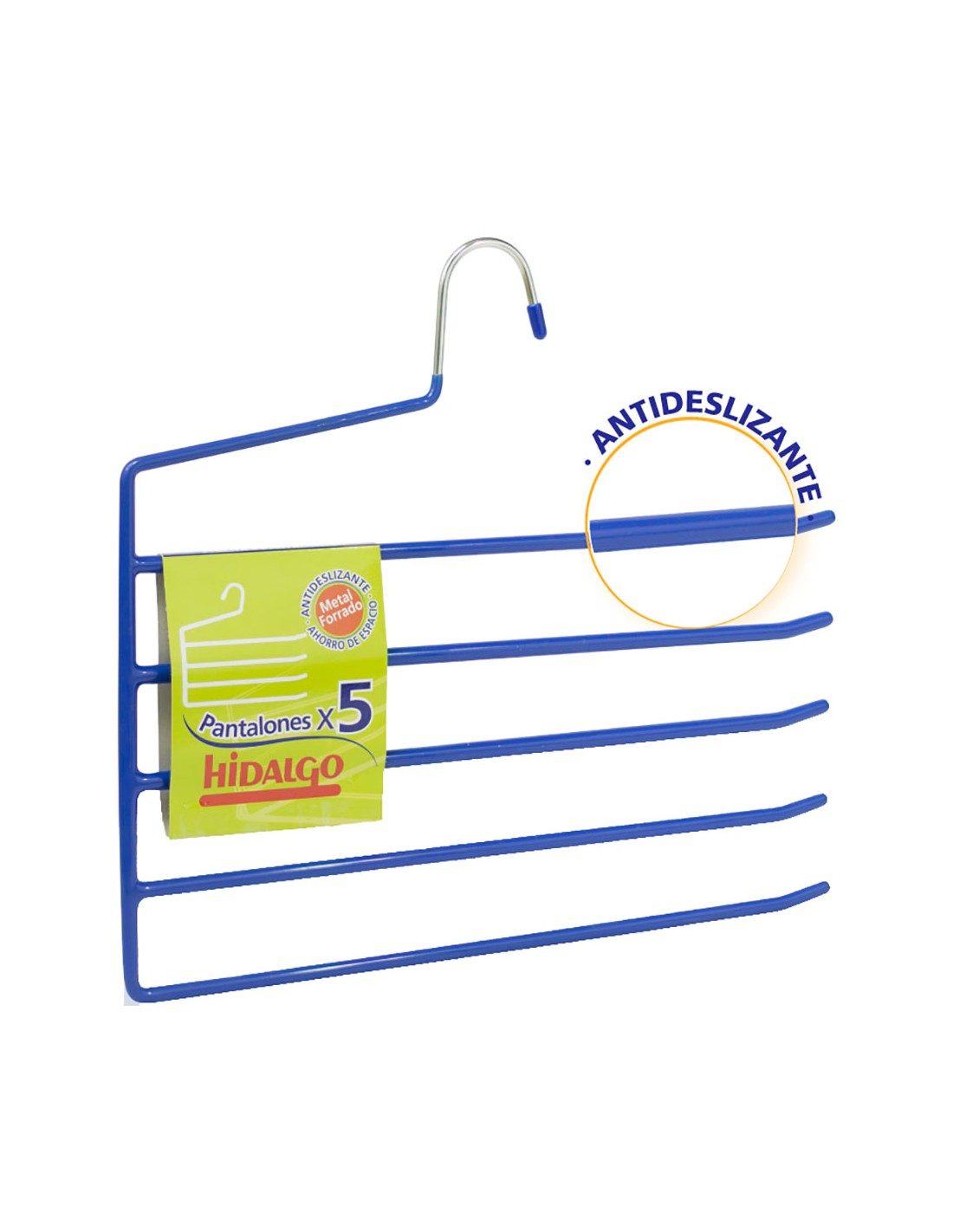 Percha fabricada en metal recubierta con goma antideslizante. diseñada para albergar varios pantalones doblados en vertical, este modelo es de 5 pisos, color azul 34 x 0,5 x 32 cm