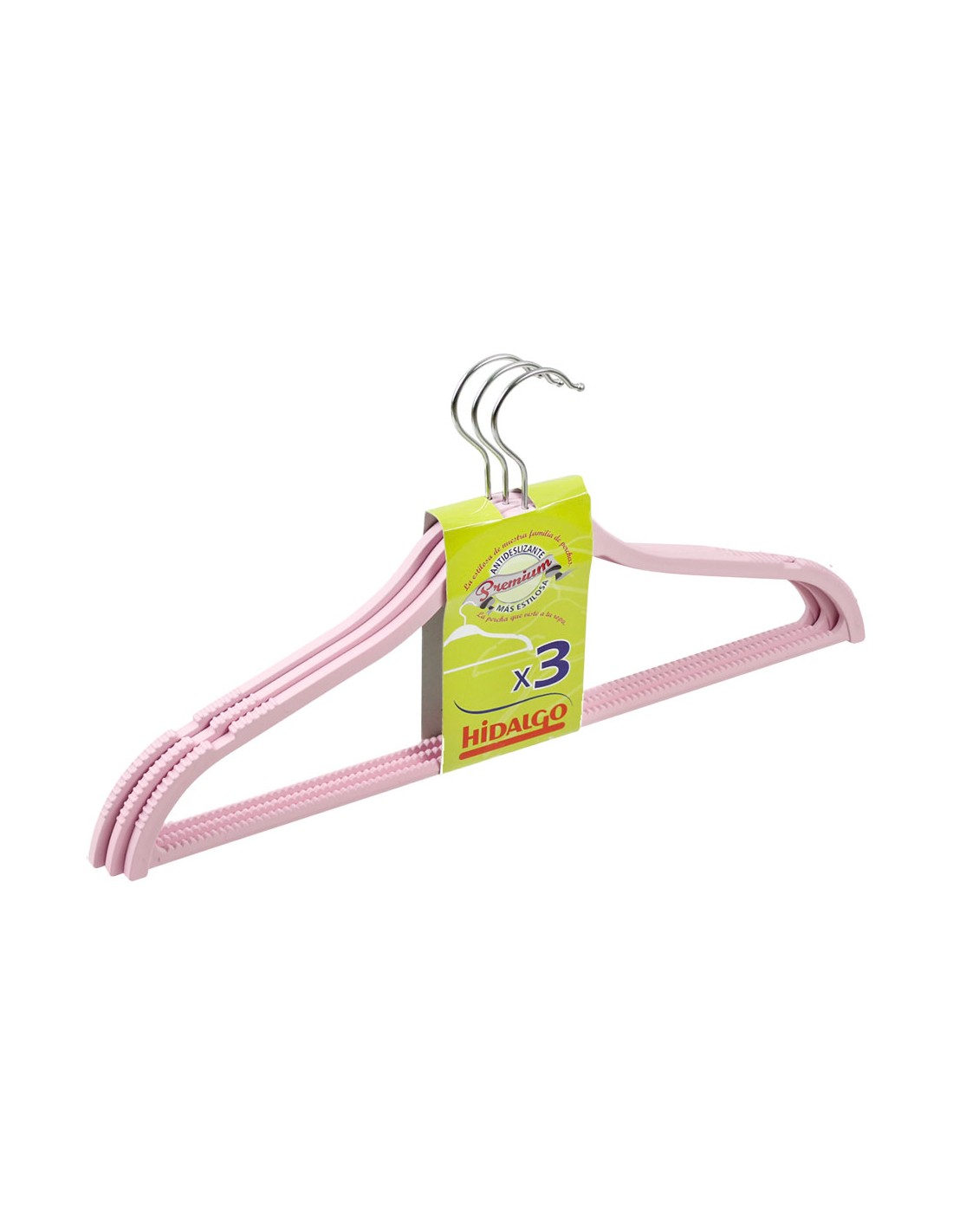 Perchas de gran calidad y diseño, engomadas con un material antideslizante y con gancho metálico. incorpora una barra central para sujetar pantalones o faldas dobladas. colores surtidos, 42 x 0,6 x 21 cm