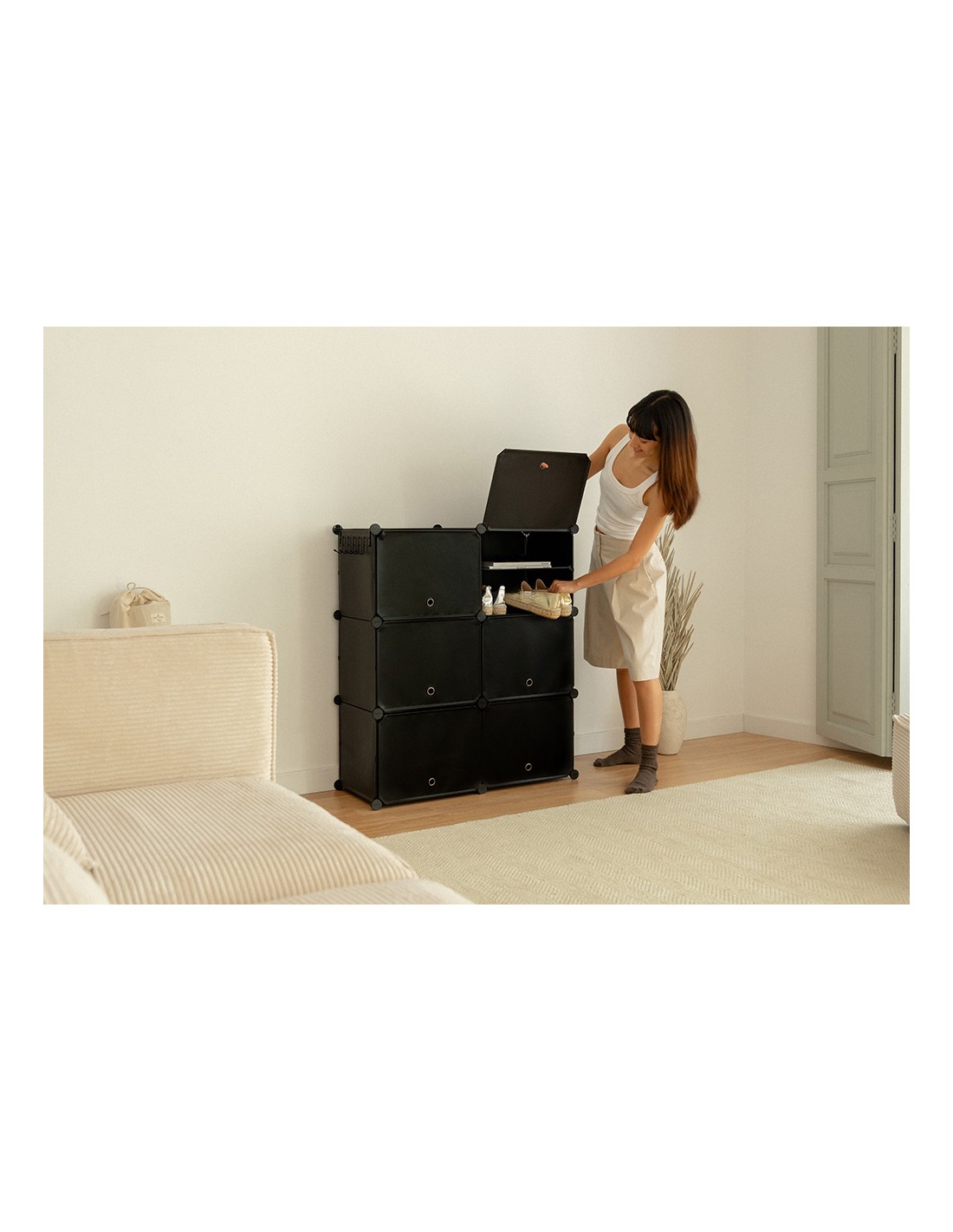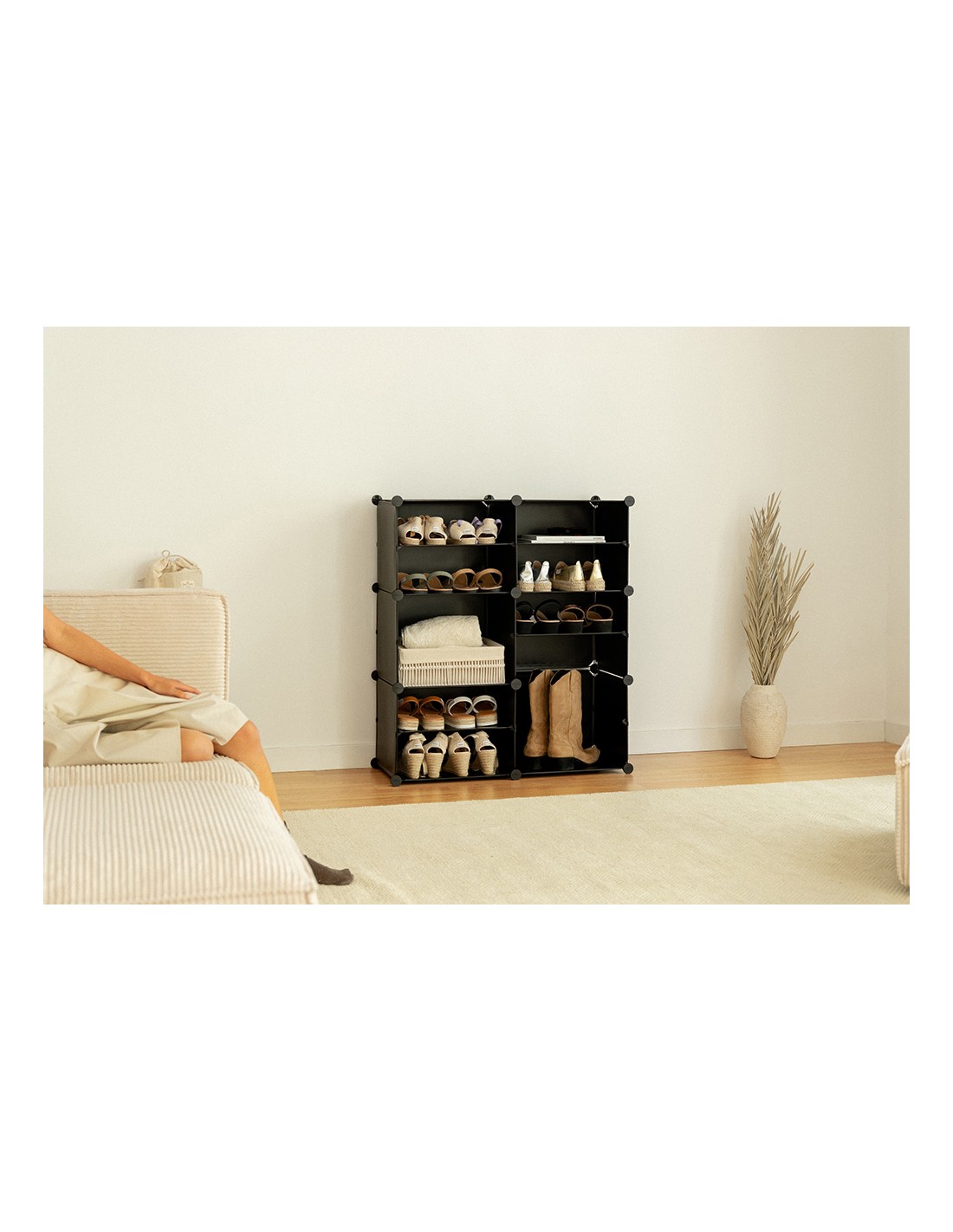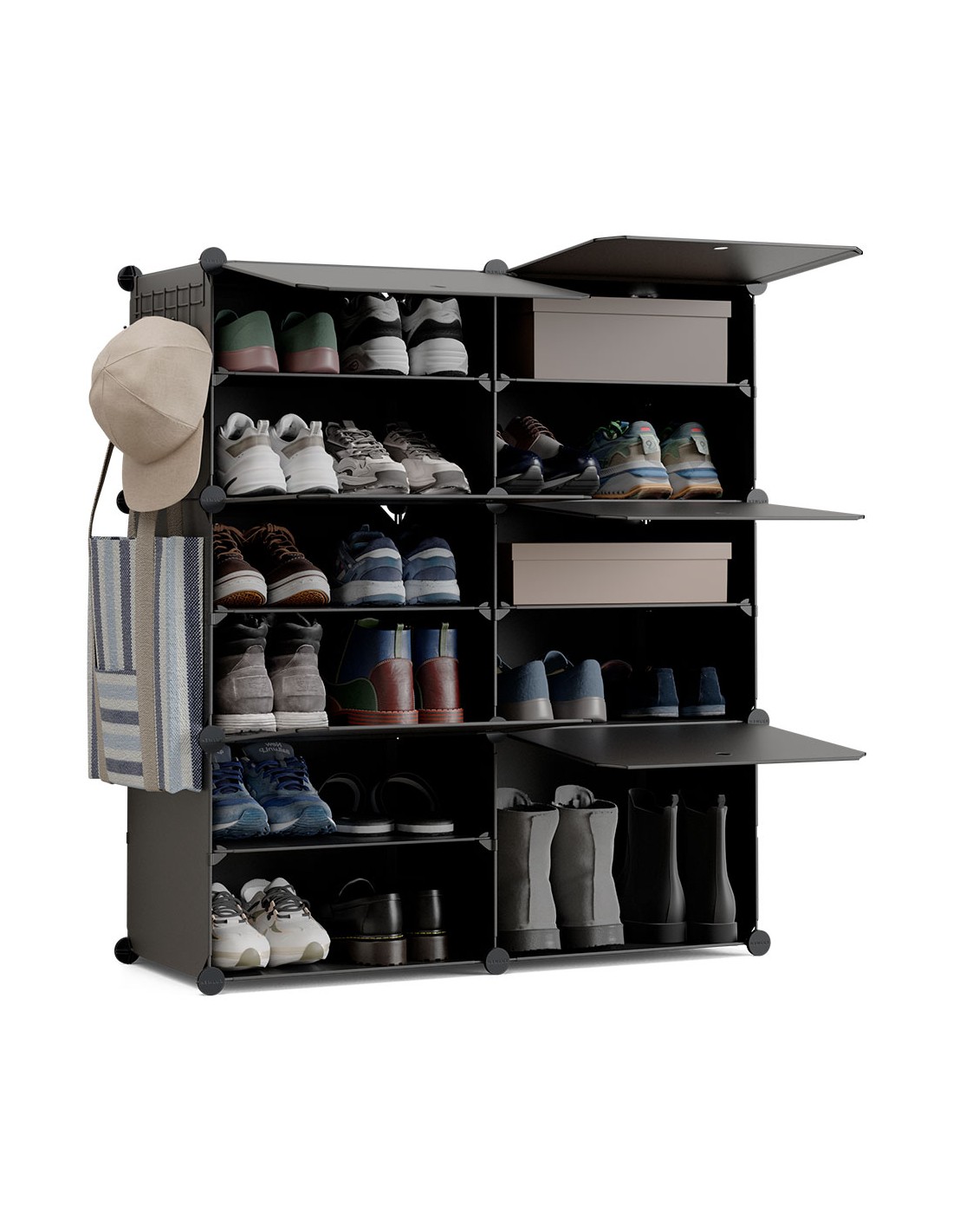 Zapatero modular de 6 cubos y 12 compartimentos 83 x 32 x 95 cm. guarda hasta 24 pares. estructura metálica y baldas de pp, soporta hasta 30 kg (5 kg por compartimento). dimensiones del cubo: 40 x 30 x 30 cm. diseño modular configurable en vertical, horizontal o escalera. perchero lateral. fácil montaje, incluye martillo. puertas abatibles con ventilación