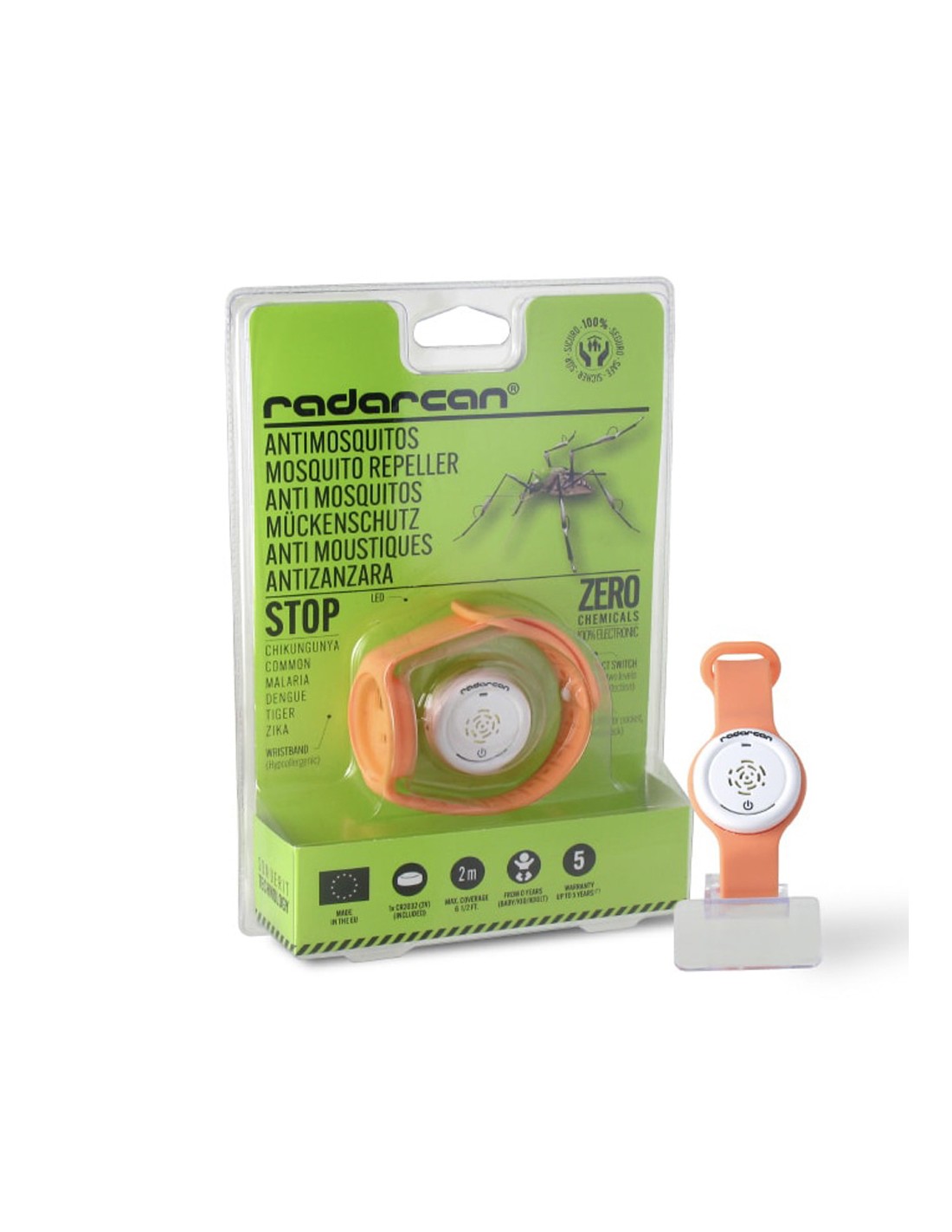 Antimosquitos personal plus de pulsera. doble uso: con pulsera ajustable y clip de sujecion. duracion de la pila 10 meses (4h/dia). 1xcr2032 (3v) incluida.radio de accion 2m. a partir de 0 años. radarcan colores / modelos surtidos