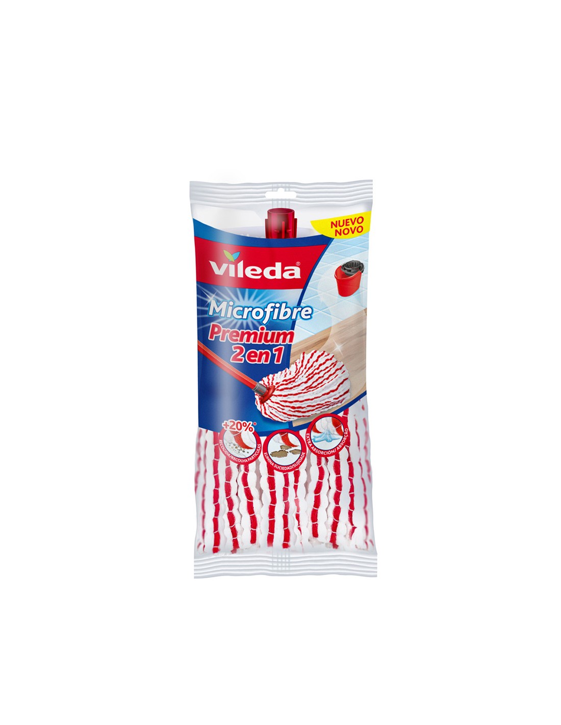 Fregona de microfibra premium 2 en 1. maxima retencion de cordones, material abrasivo en el exterior y tiras formadas por tres cordones. los rojos eliminan la suciedad mas incrustada sin rayar. apto tanto para palos monoclic como universales. los cordones blancos garantizan la maxima absorcion y con un trenzado unico para que no deshilachen. cabezal universal