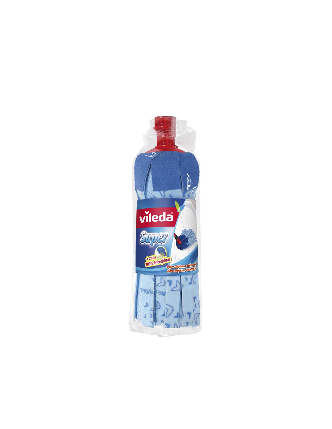 Fregona super + 30% microfibras. la parte superior de la fregona esta laminada con un material 100% microfibras que da mayor resistencia y capacidad de limpieza. es muy resistente y limpia hasta la suciedad mas incrustada. el material de la fregona, es decir las tiras, incorporan un 30% de microfibras que incrementa la absorcion y capacidad de limpieza de la fregona. seca los suelos rapida y eficazmente. con el cabezal limpia-rincones, exclusivo de vileda, podrá acceder y limpiar facilmente todas las esquinas y rincones. ademas, el cabezal de la fregona tiene anclaje universal que la hace apta para usarse tanto con los palos de vileda como con otros palos de rosca