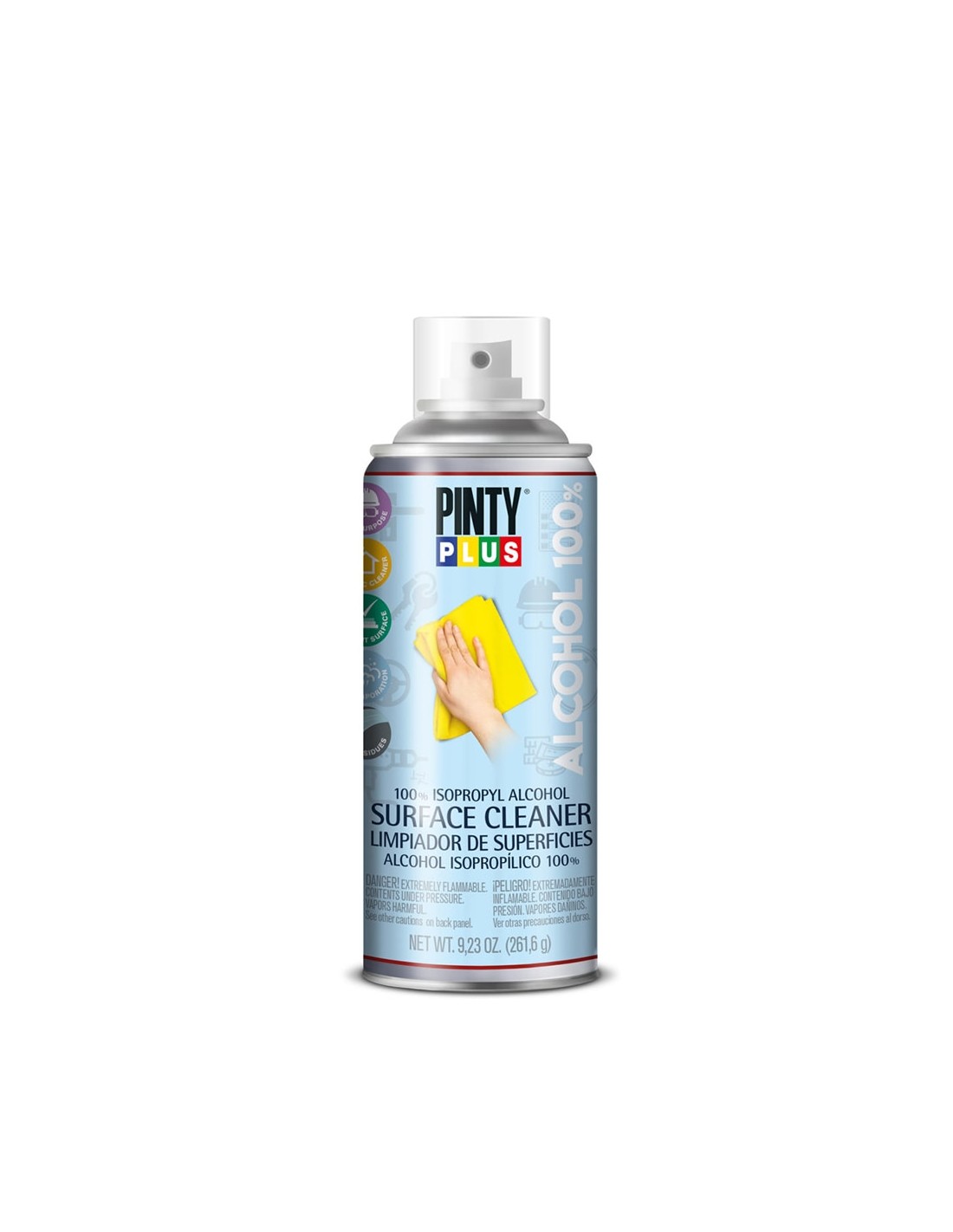Limpiador para objetos y superficies 100% alcohol isopropilico en spray 400ml . limpiador 100% alcohol isopropilico deseninfectante y desengrasante de superficies de uso profesional y doméstico. elimina toda la clase de residuos. limpie y desinfecte toda clase de superficies, circuitos electricos (con el equipo apagado), herramientas, elementos opticos, informaticos, impresoras (incluso 3d) y todo tipo de objetos cotidianos (llaves, monedas, tarjetas, espejos, epis, interior del vehículo...). no deja residuos y se evapora instantaneamente. en el caso de querer limpiar una superfice delicada, evitar la abrasión frotando. es necesario utilizar una bayeta para quitar la suciedad en las superficies donde la suciedad o posible contaminación estuviera muy presente. pinty plus