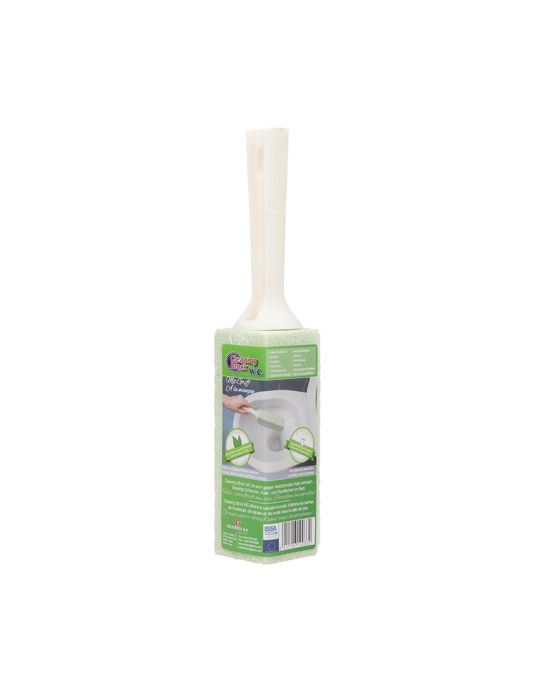 Cleaning block wc verde con mango. 100% vidrio celular. 12,5x4x4cm (+-1mm) 60g dureza medio-bajo. no toxico, ecologico, no irritante, bacteriostatico, seguro y efectivo, resistente quimicamente.