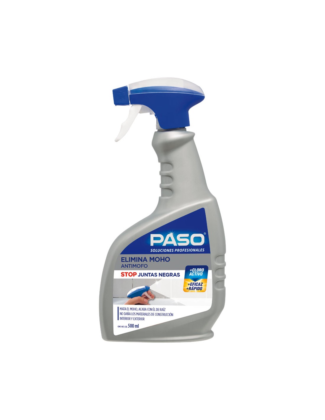 Paso elimina moho 500ml. elimina moho, acaba de raíz con las manchas de moho, algas y musgo producidas por la humedad, proporcionando a la superficie una protección duradera. su fórmula con cloro activo limpia y blanquea las juntas tanto de interior como de exterior.