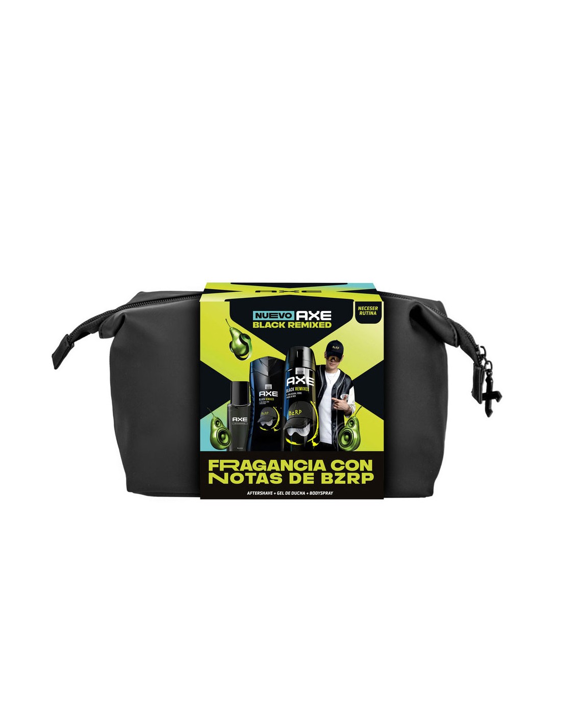 Neceser black remixed bizarrap. contiene: bodyspray + gel dxe ducha + aftershave