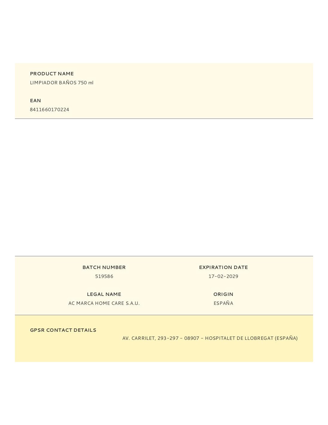 Limpiador baños 750 ml. limpiador desinfectante antical especial para baños que elimina el 99,9% de los gérmenes. es eficaz contra bacterias y hongos, como los responsables de la formación del moho. además reduce el riesgo de alergia al moho. ideal para bañeras, lavabos, sanitarios, griferías, mamparas...