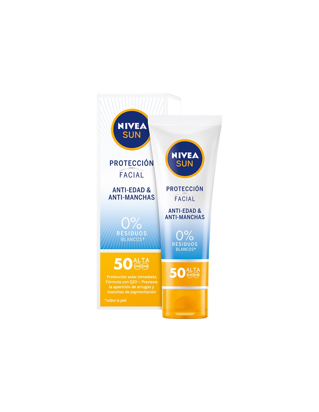 Nivea facial f50 antiedad q10 50ml. desarrollada especialmente para la delicada piel del rostro. su formula con proteccion ultraespectro protege la piel del daño inducido por los rayos uva/uvb y de los efectos de la luz visible de alta energia (hevl) como el envejecimiento prematuro. su formula con q10 previene y combate la aparicion de lineas, arrugas y machas de pigmentacion inducidas por el sol. para piel normal/seca. sensacion ligera y sedosa en la piel. ideal para uso diario. formula compatible con el contorno de ojos. oftamologicamente comprobada.
