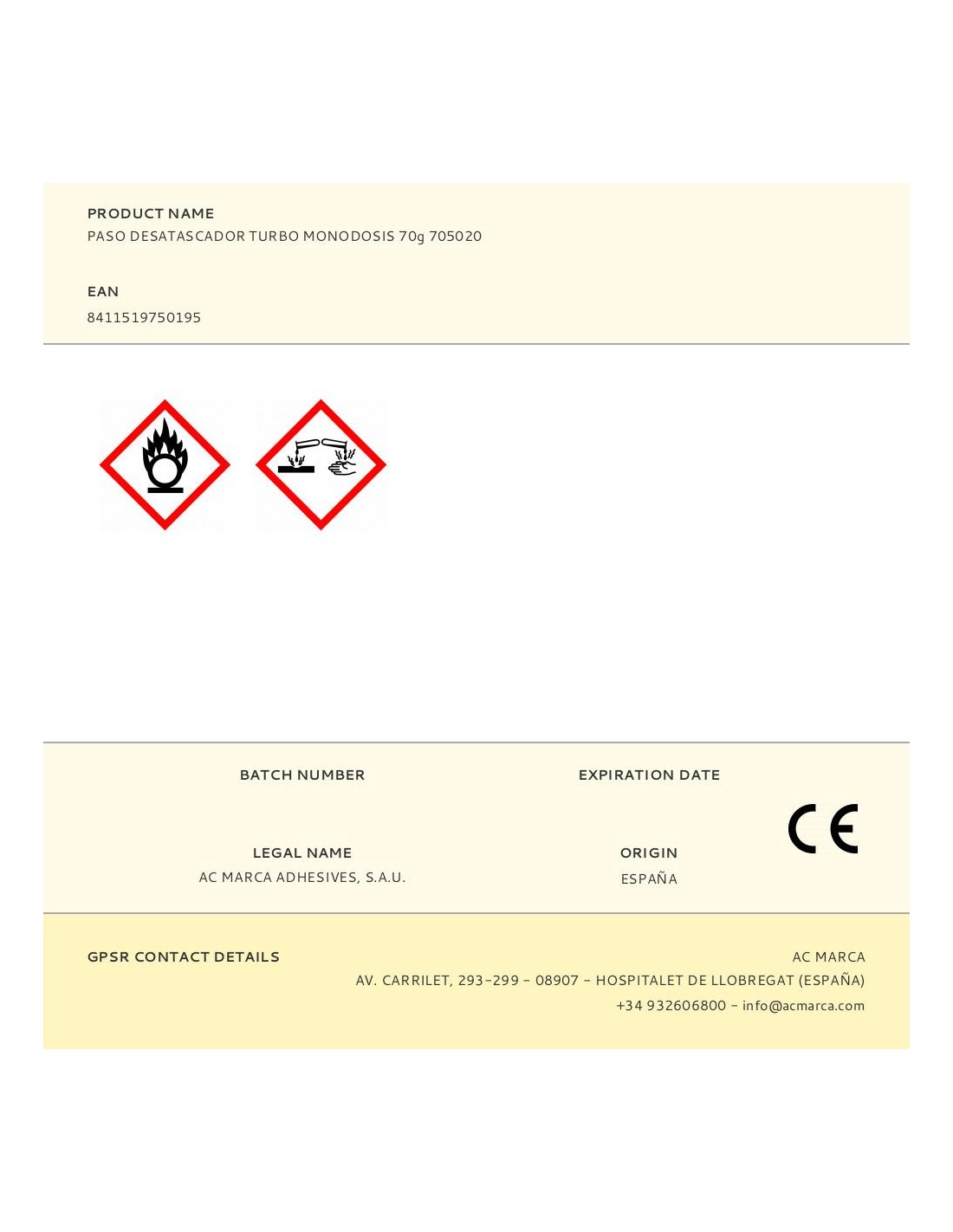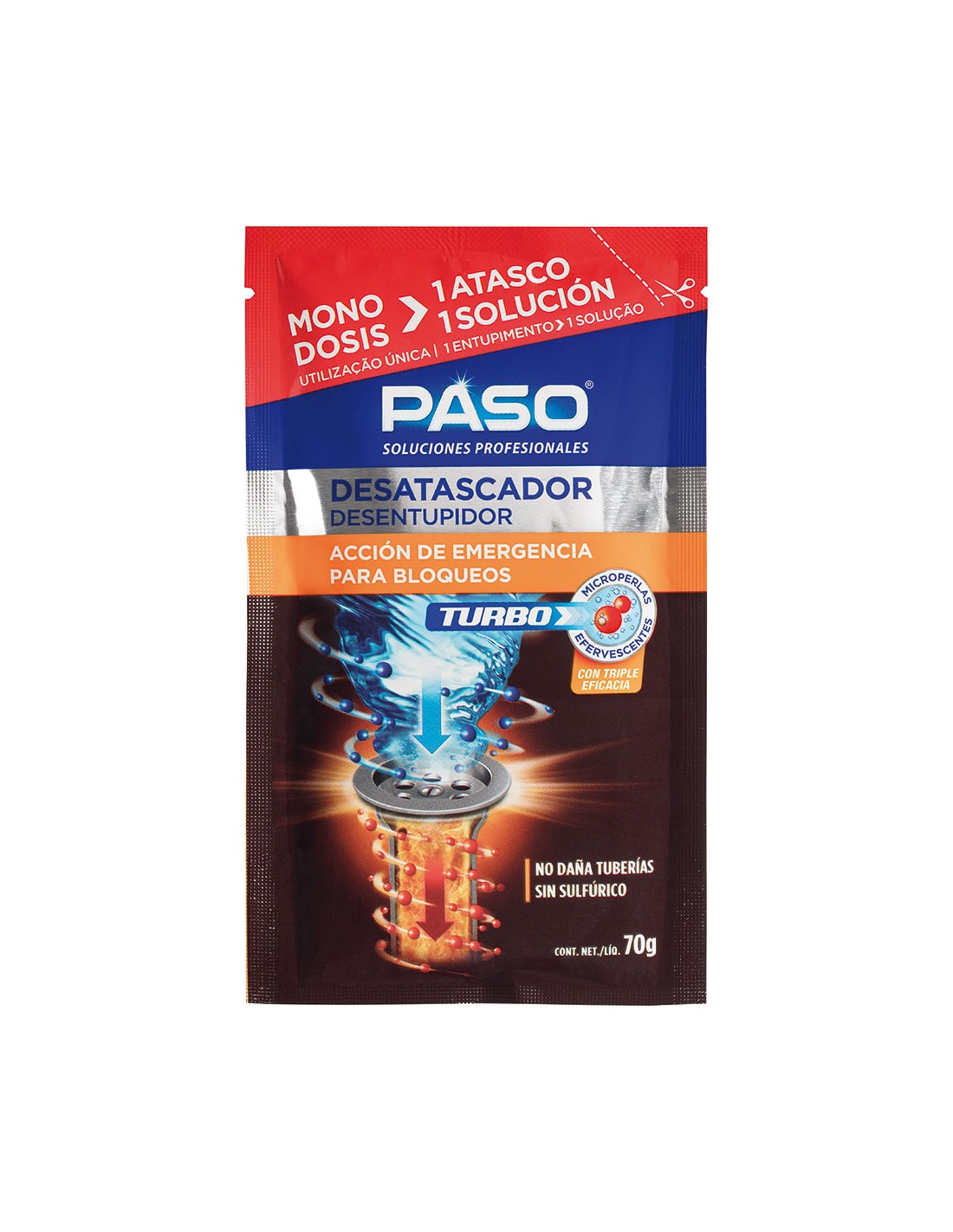 Paso desatascador turbo monodosis 70g 705020. desatacador con fórmula de gel super denso a base de sosa cáustica que consigue la solución más potente y rápida para desatascar cualquier tubería.apto para tuberías lentas o atascos severos. sin ácido sulfúrico