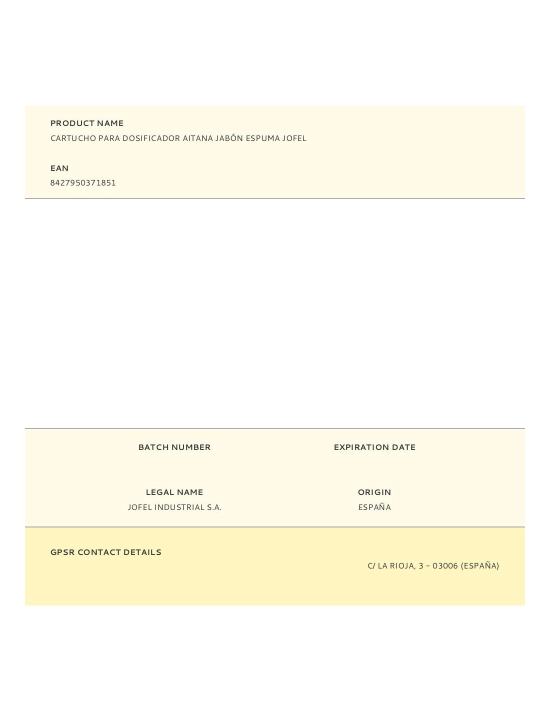 Cartucho para dosificador aitana jabón espuma jofel. semi-rígidos fabricados en polietileno de alta calidad y resistencia,colapsables y reciclables,capacidad de 1 litro,cada cartucho incorpora válvula integrada, desechable y no reutilizable,válvula anticorrosiva y antigoteo,uso exclusivo en dosificadores aitana multifunción,intercambiabilidad: posibilidad de alternar o cambiar cartuchos de gel y espuma entre sí.gel y espuma de alta calidad, certificada y homologada para usos diversos,ph neutro y ausencia de agentes agresivos,características: destaca por gran formación de espuma, textura cremosa y suave para las manos. cuida, limpia, protege y suaviza la piel. perfume fresco y duradero. contiene agentes hidratantes y suavizantes,dosis: 1g de jabón, 0,35g de espuma.