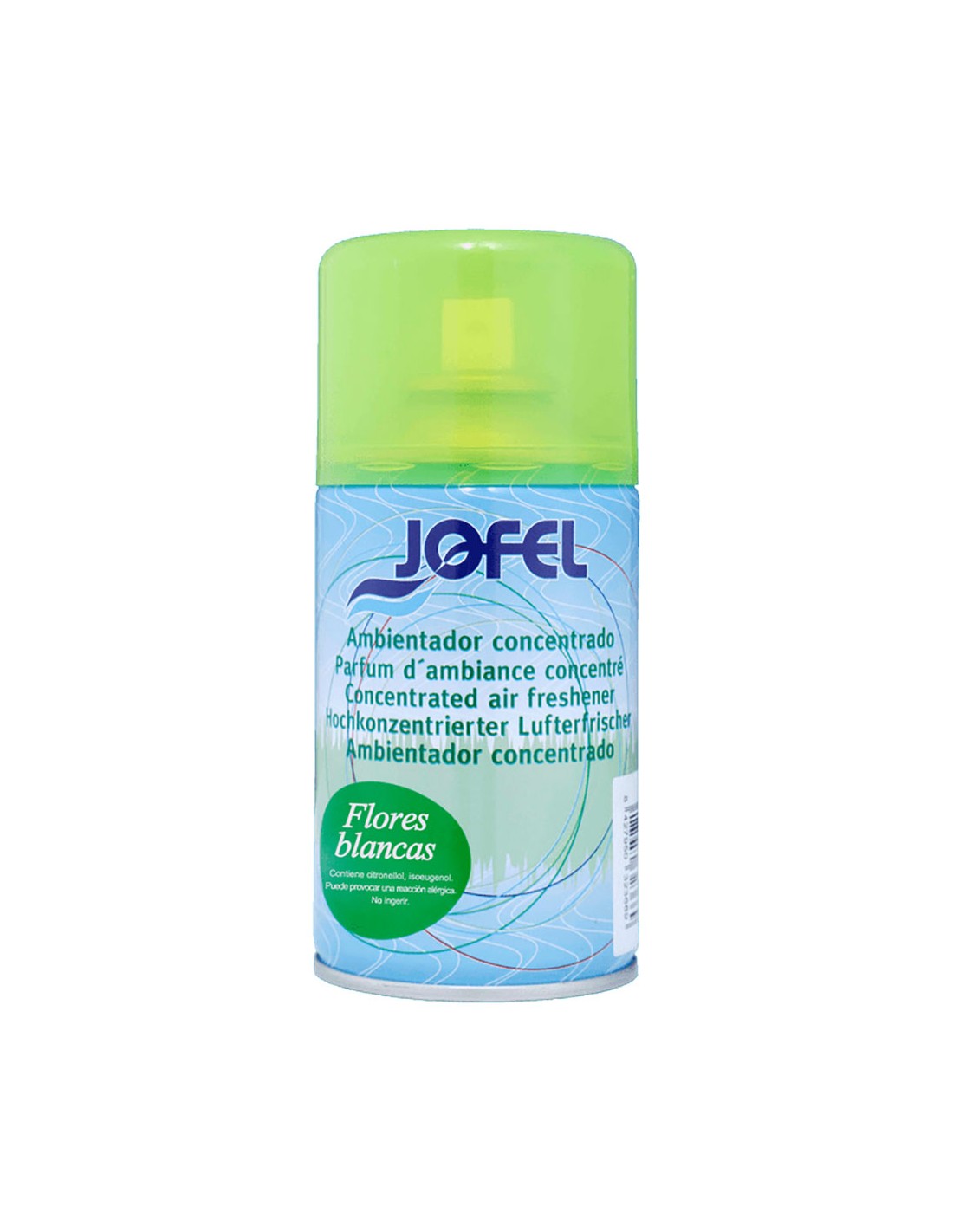 Ambientador concentrado para difusor flores blancas jofel. ambientador aerosol concentrado, perfume flores blancas, ambientador con alta concetración de perfume: 6%. envase metálico con válvula de seguridad que impide dispensación larga y continuada,envasado con perfume natural y gas inocuo e inofensivo para la capa de ozono,uso exclusivo con difusor de origen,tapón protector para evitar descargas no deseadas,incorpora, adicionalmente, dentro del tapón protector un difusor universal para uso general,descarga de 0,065/0,075g. por pulsación/dosis, efecto ambientador inmediato y persistente, especialmente indicado para oficinas, baños y establecimientos públicos, uso generalizado y universal. capacidad 250ml.
