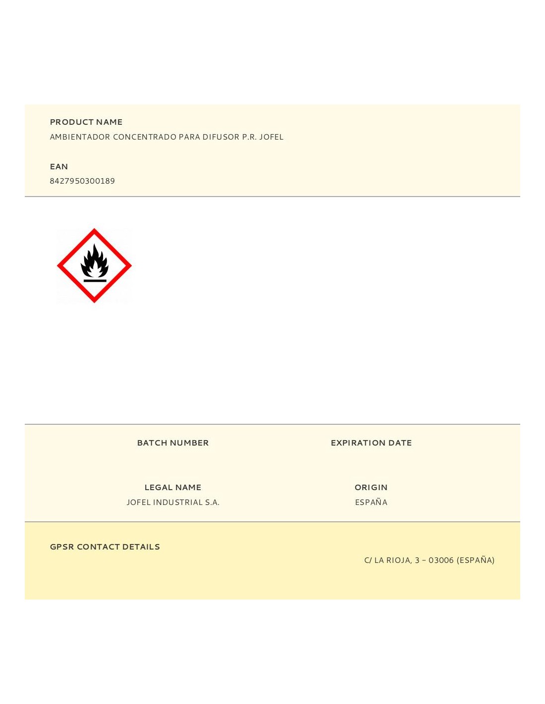 Ambientador concentrado para difusor p.r. jofel. ambientador aerosol concentrado, perfume p.r. ambientador con alta concetración de perfume: 6%. envase metálico con válvula de seguridad que impide dispensación larga y continuada, envasado con perfume natural y gas inocuo e inofensivo para la capa de ozono, uso exclusivo con difusor de origen, tapón protector para evitar descargas no deseadas, incorpora, adicionalmente, dentro del tapón protector un difusor universal para uso general, descarga de 0,065/0,075g. por pulsación/dosis, efecto ambientador inmediato y persistente, especialmente indicado para oficinas, baños y establecimientos públicos, uso generalizado y universal. capacidad 250ml.