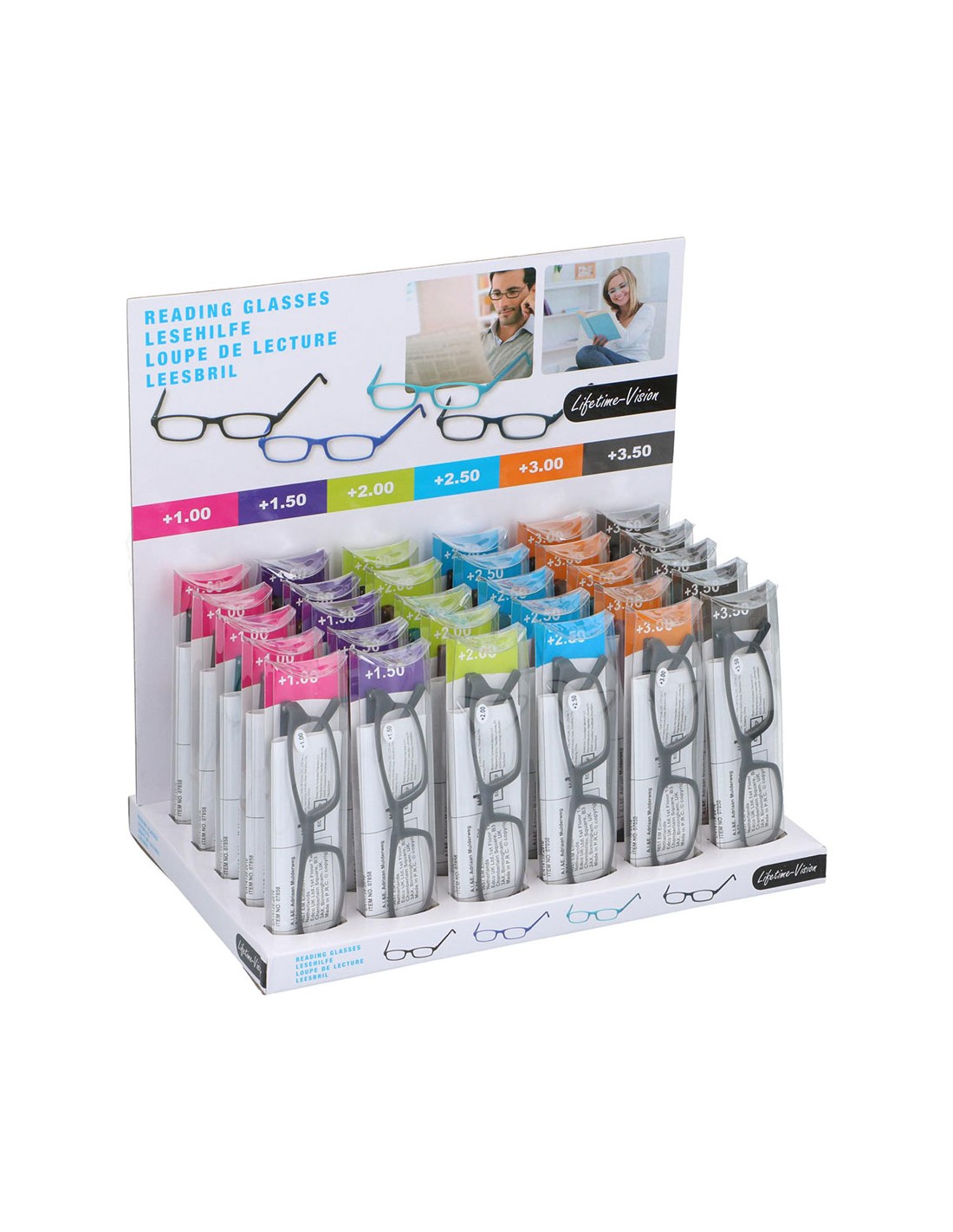Gafas de lectura lifetime vision, dioptrías +1, +1,5, +2, +2,5, +3, +3,5. presentada en expositor de 30 uds, colores surtidos