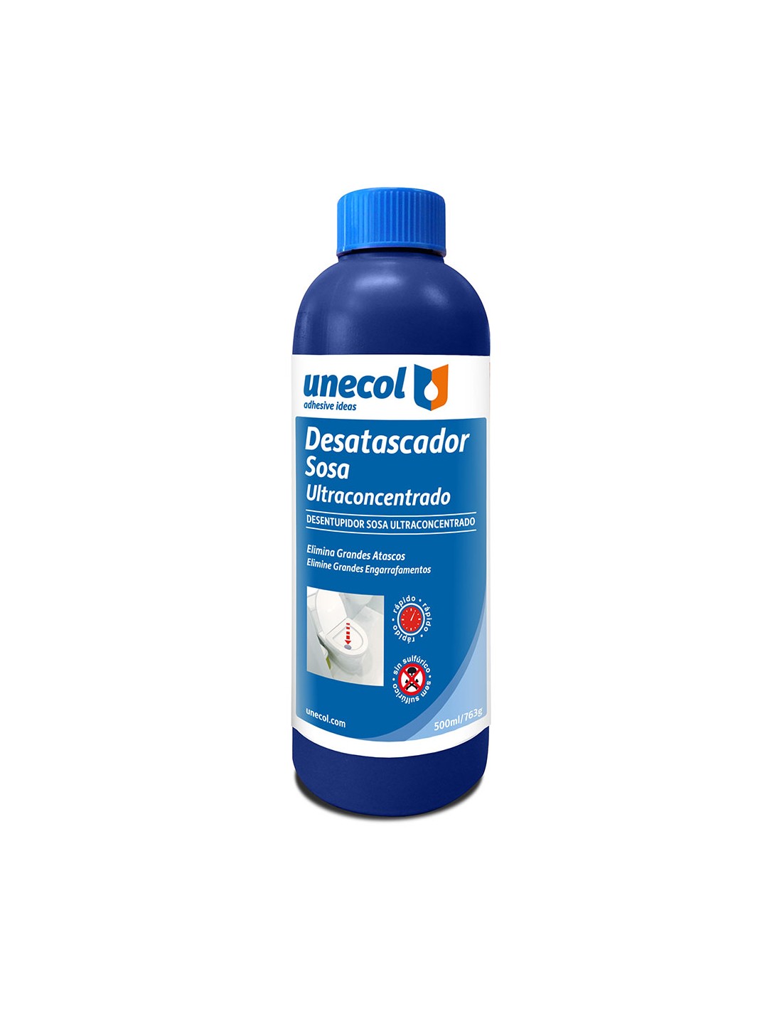 Desatascador sosa ultra 500ml c02430 potente desatascador alcalino a base de hidróxido sódico al 50%. capaz de eliminar atascos y malos olores producidos por restos de materiales orgánicos, como trapos, comida, celulosas, papel, cabellos, jabones, grasas y detergentes. su uso mensual previene la formación de atascos y la aparición de malos olores en los desagües. no ataca a los conductos ni a las fosas sépticas. puede dañar determinados materiales. unecol