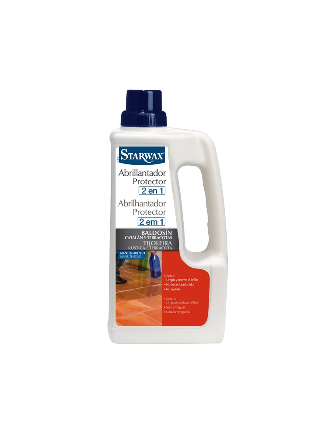 Abrillantador protector 2 en 1 (baldosín catalán y terracotas). mantiene y devuelve el brillo, difumina los aranazos y prolonga el efecto protector del renovador, utilizado diluido, no necesita aclarado, no resvala. realizar una prueba previamente.