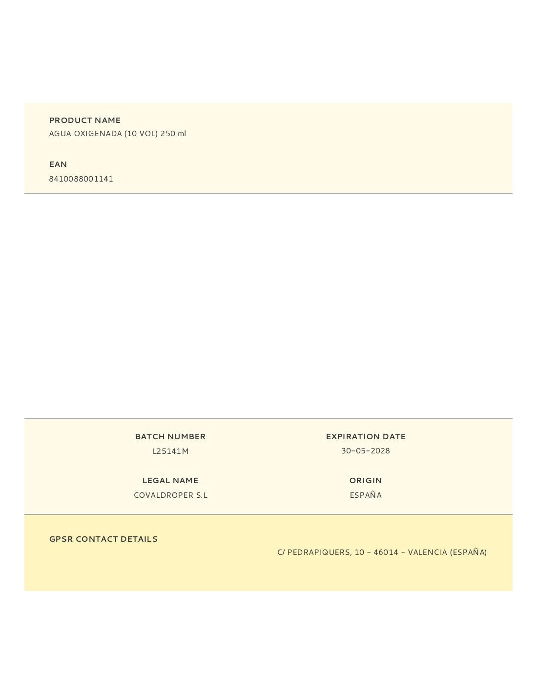 Propiedades: líquido incoloro de olor característico. miscible totalmente en agua. cada volumen de agua oxigenada descompone dando 10 vólumenes de oxígeno. aplicaciones: como producto cosmético. limpieza e higiene de la piel sana. por sus caracteristicas oxidantes es un buen agente desinfectante,antiséptico,blanqueante y desodorizante.composición: disolución acuosa de peróxido de hidrógeno al 3%. agua oxigenada de 10 volúmenes.