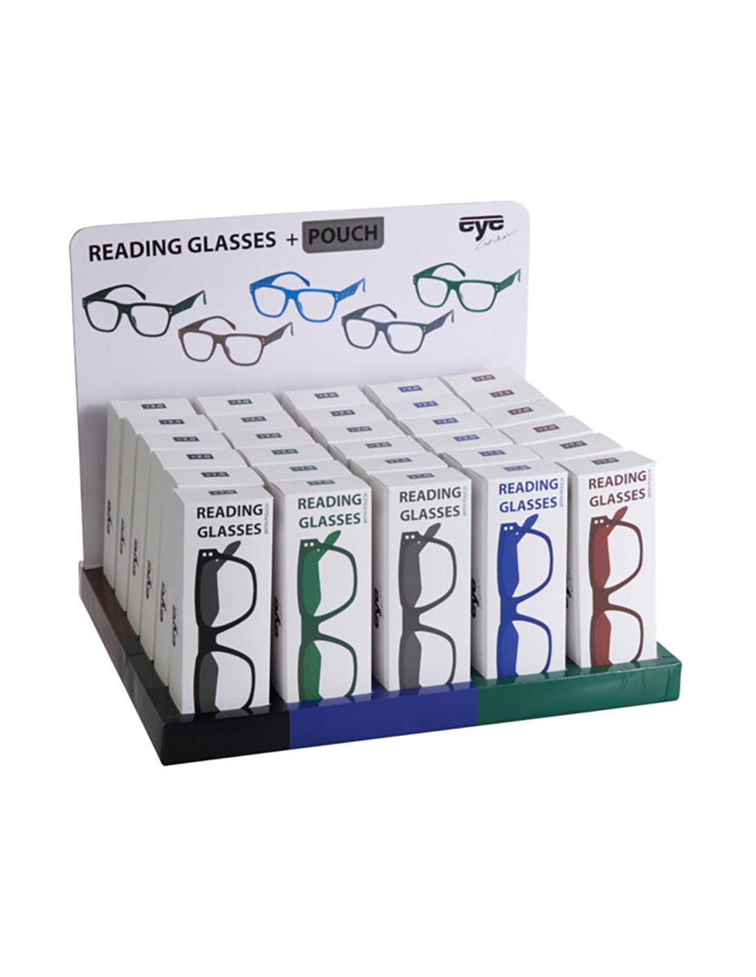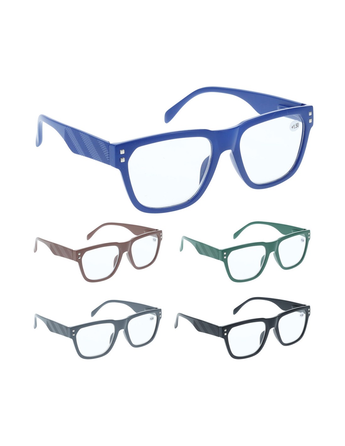 Gafas de lectura con funda, dioptrias +1, +1,5 , +2 , +2,5, +3. presentada en expositor de 30 uds, colores surtidos