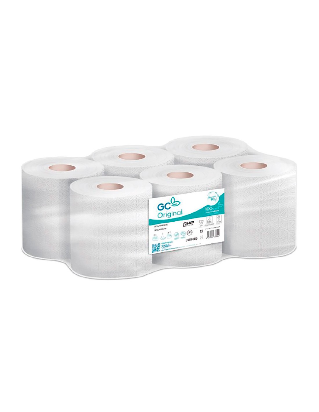Bobina papel secamanos 2 capas 100 % fibra virgen con 477 servicios y 143 m. pack de 6 uds