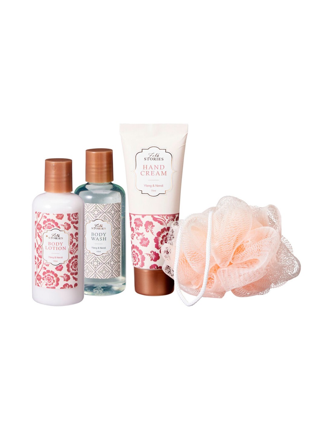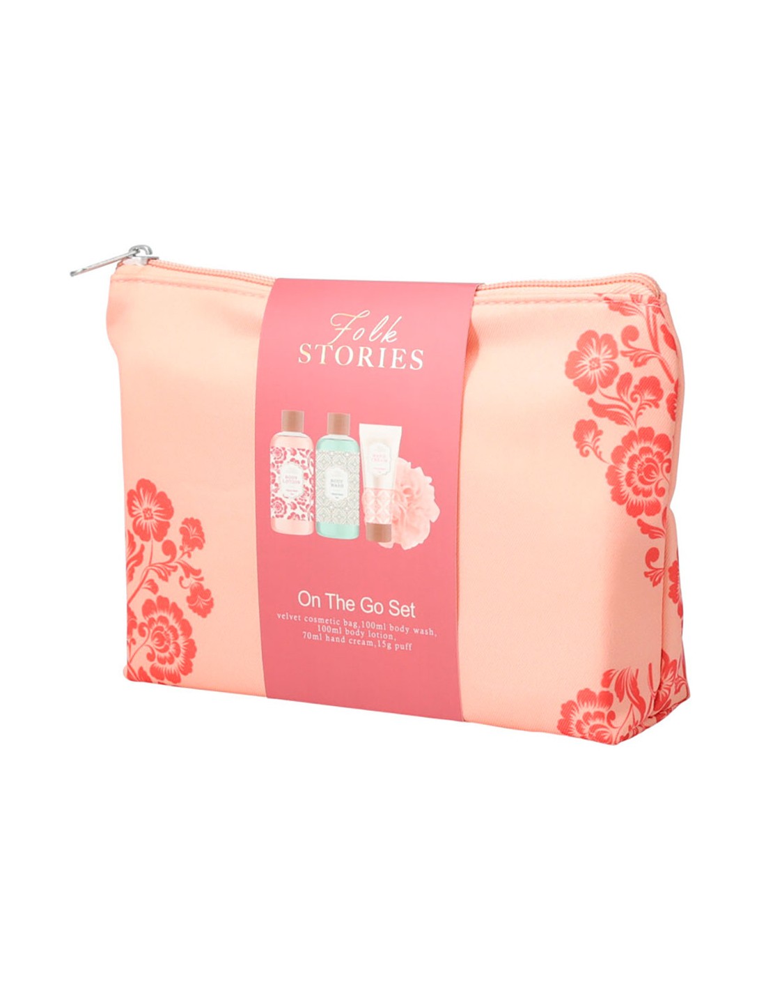 Neceser folk stories compuesto por gel de ducha 100 ml, loción corporal 100 ml, crema de manos 70 ml, espuma 15 g y bolsa cosmética con diseños florales