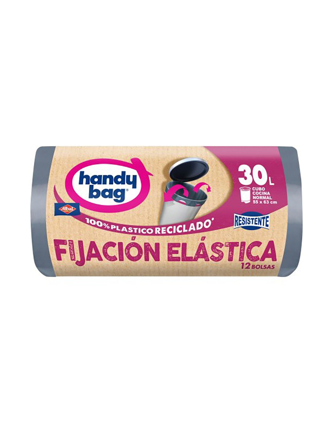 Bolsa de basura de 30 l, 12 uds, con sistema de fijación elástica que asegura un cierre perfecto. fabricada con material extra resistente para evitar fugas y roturas. idóneo para cocinas, oficinas y uso doméstico. 100 % plástico reciclado. medidas: 55 x 63 cm
