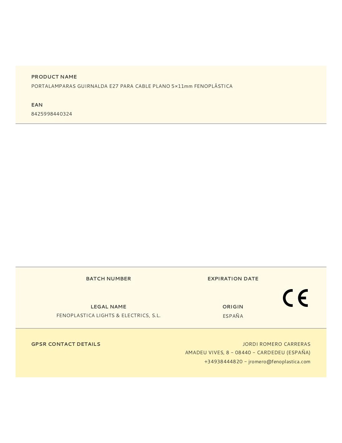 Portalamparas guirnalda e27 2a 250v termoplástico para cable plano 5×11mm sección cable 2x2,5mm (solo para cable ref.11602)