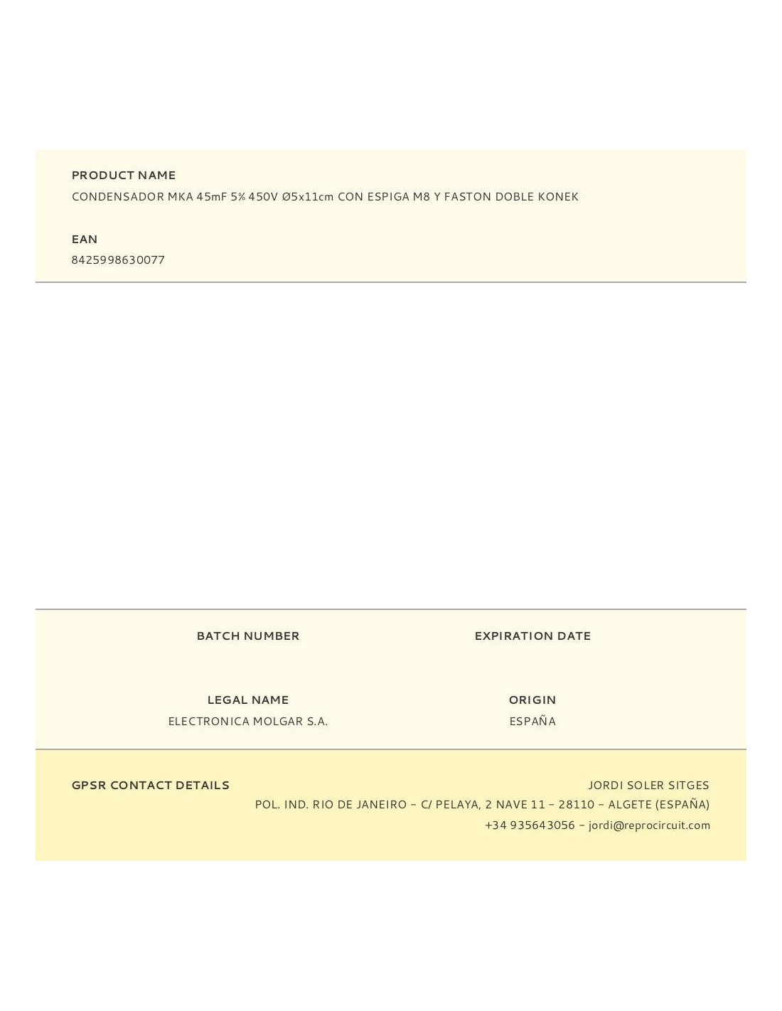 Condensador de arranque mka 45mf 5% 450v ø5x11cm con espiga m8 y faston doble konek