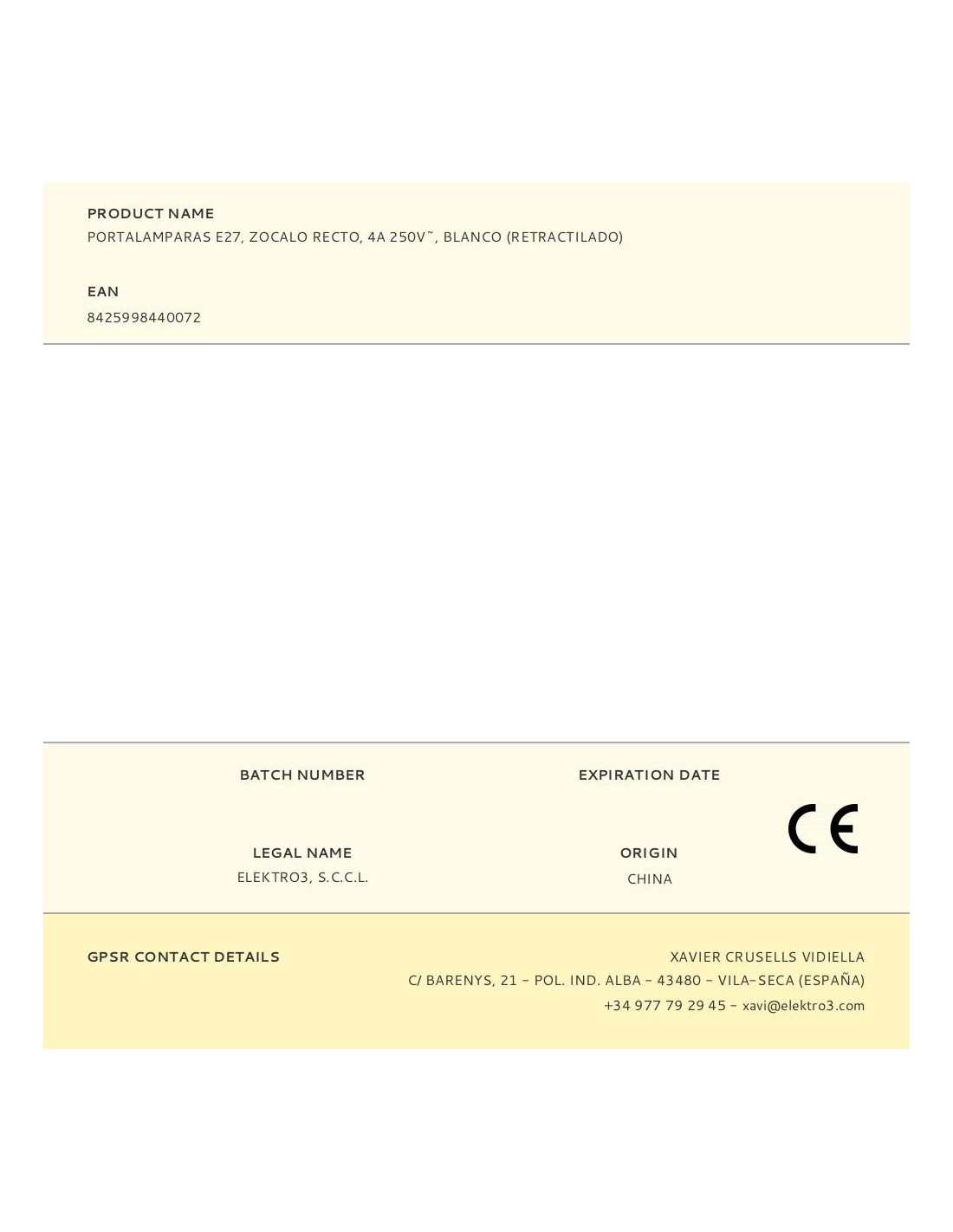 Portalamparas e27, zocalo recto, 4a 250v~, máximo 40w, blanco, base ø7,5 x 5,5 cm