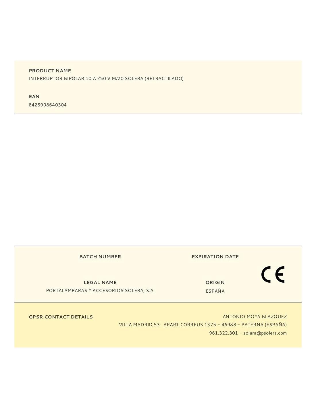 Interruptor bipolar 10a 250v m/20 solera