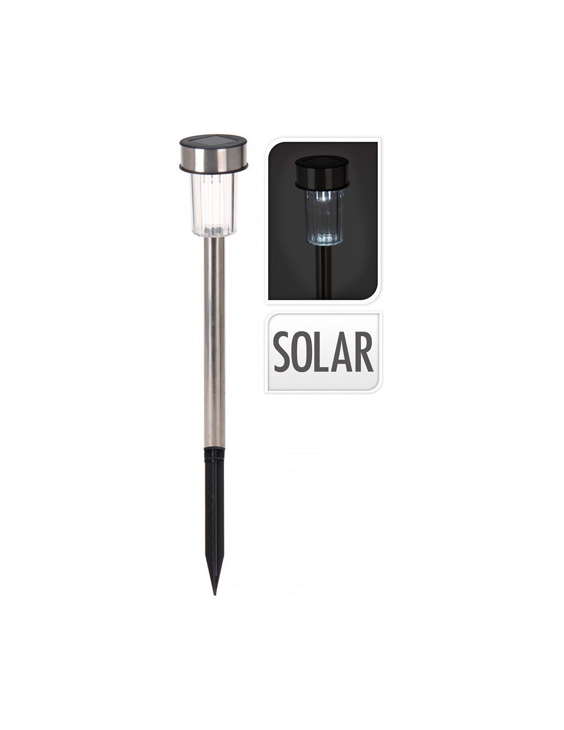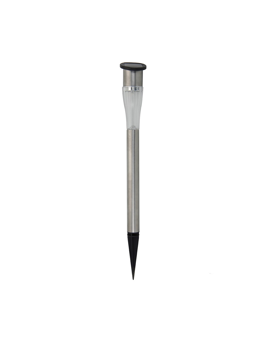 Estaca solar 36cm inox mod. cilindro euro/u con un led de luz blanca. pila de boton recargable. con interruptor 6 horas de funcionamento aprox.